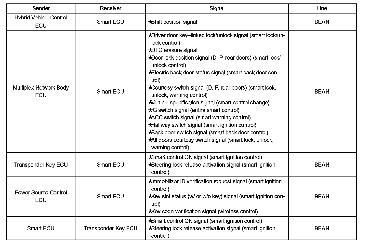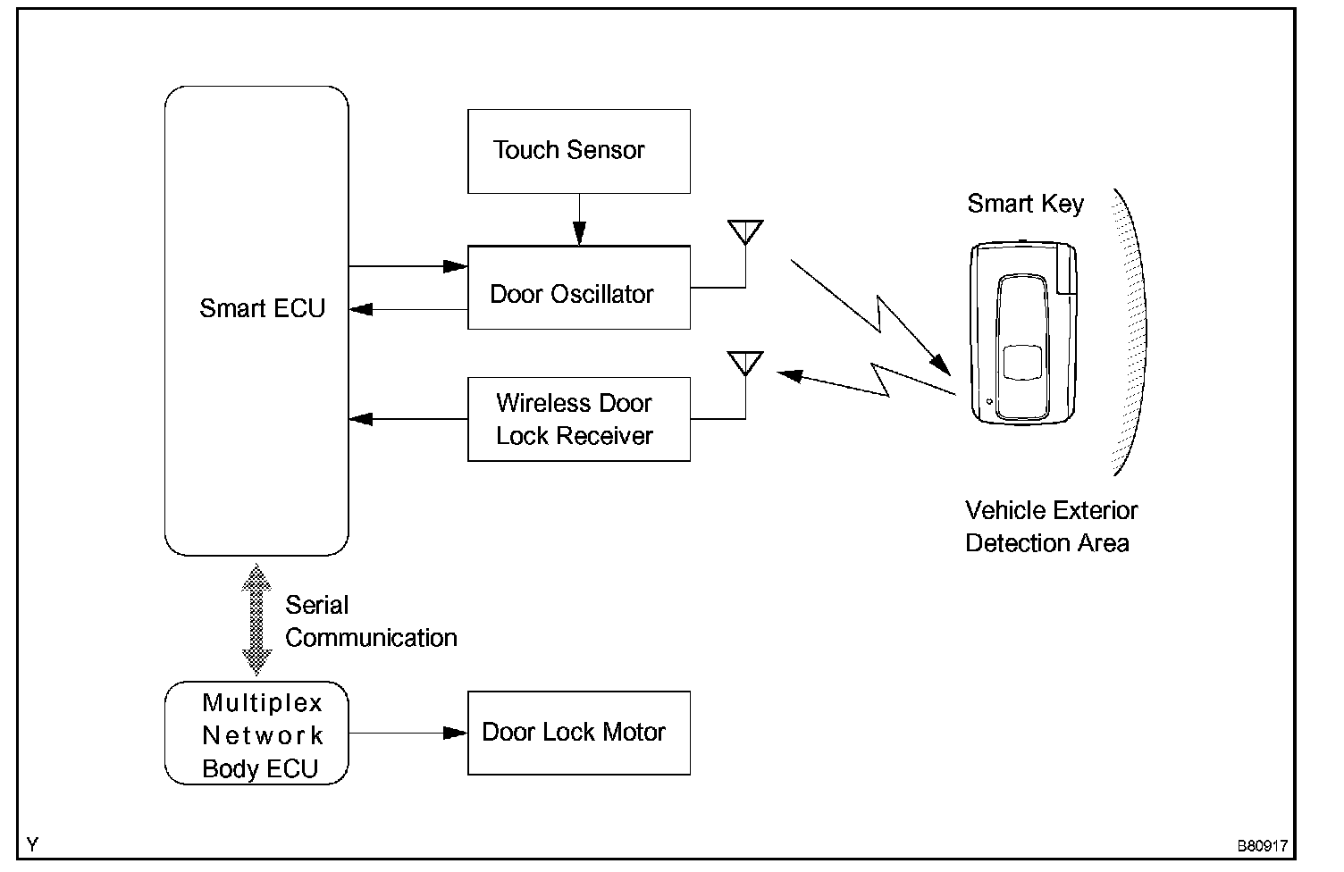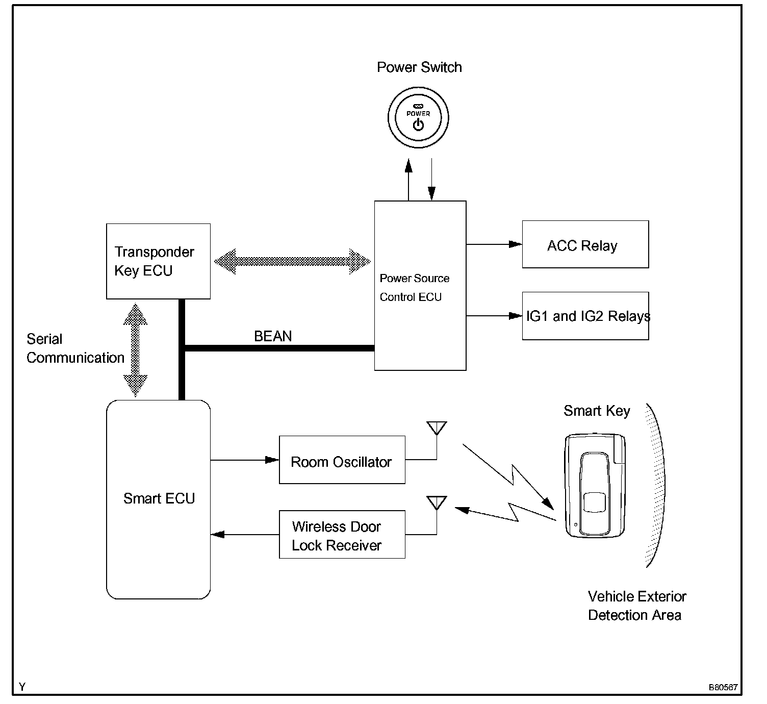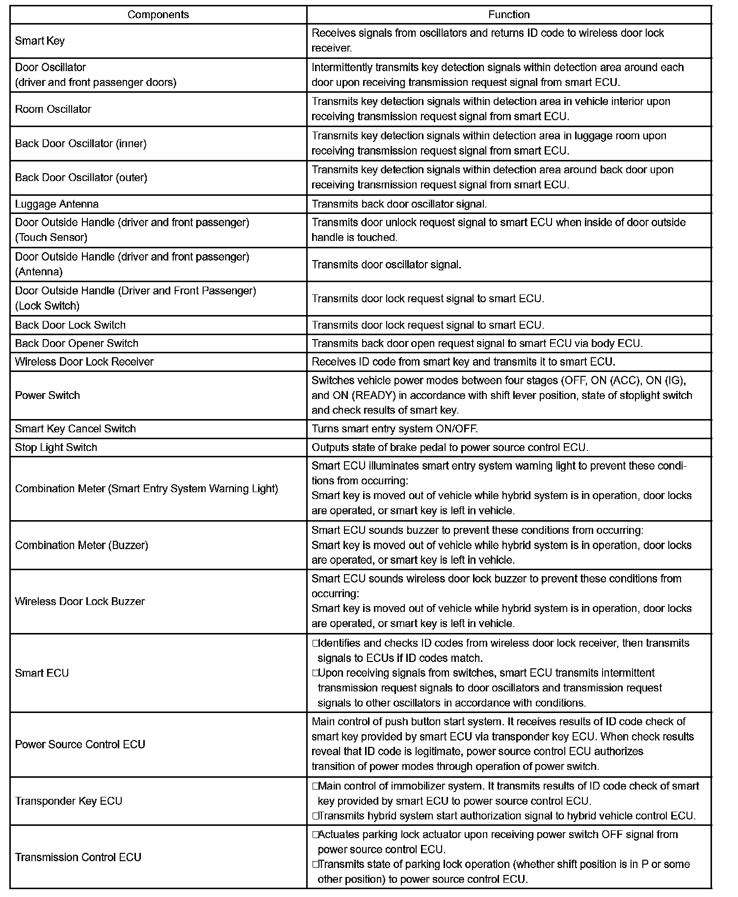 - This system consists of a smart key ECU, power source control ECU, transponder key ECU, body ECU, smart key, 5 oscillators, 5 antennas, 2 touch sensors, 3 lock switches, and a wireless door lock receiver. The smart ECU controls the system.