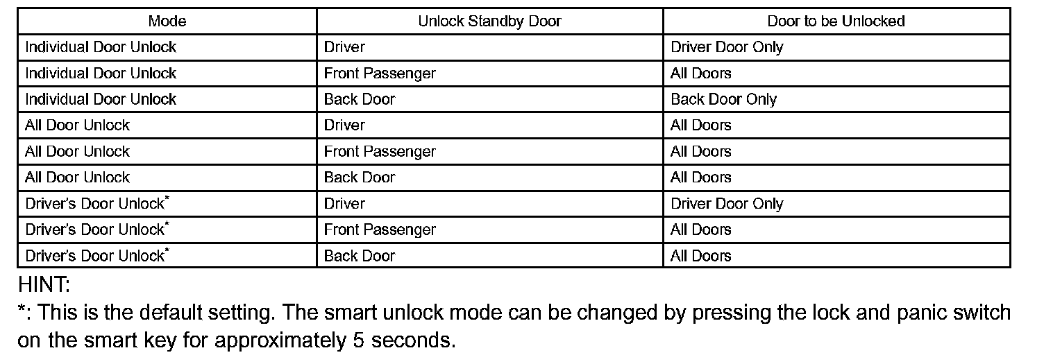 HINT: *: If smart unlock is set to individual door unlock mode, only the back door will be unlocked. If set to all door unlock mode, all doors will be unlocked.