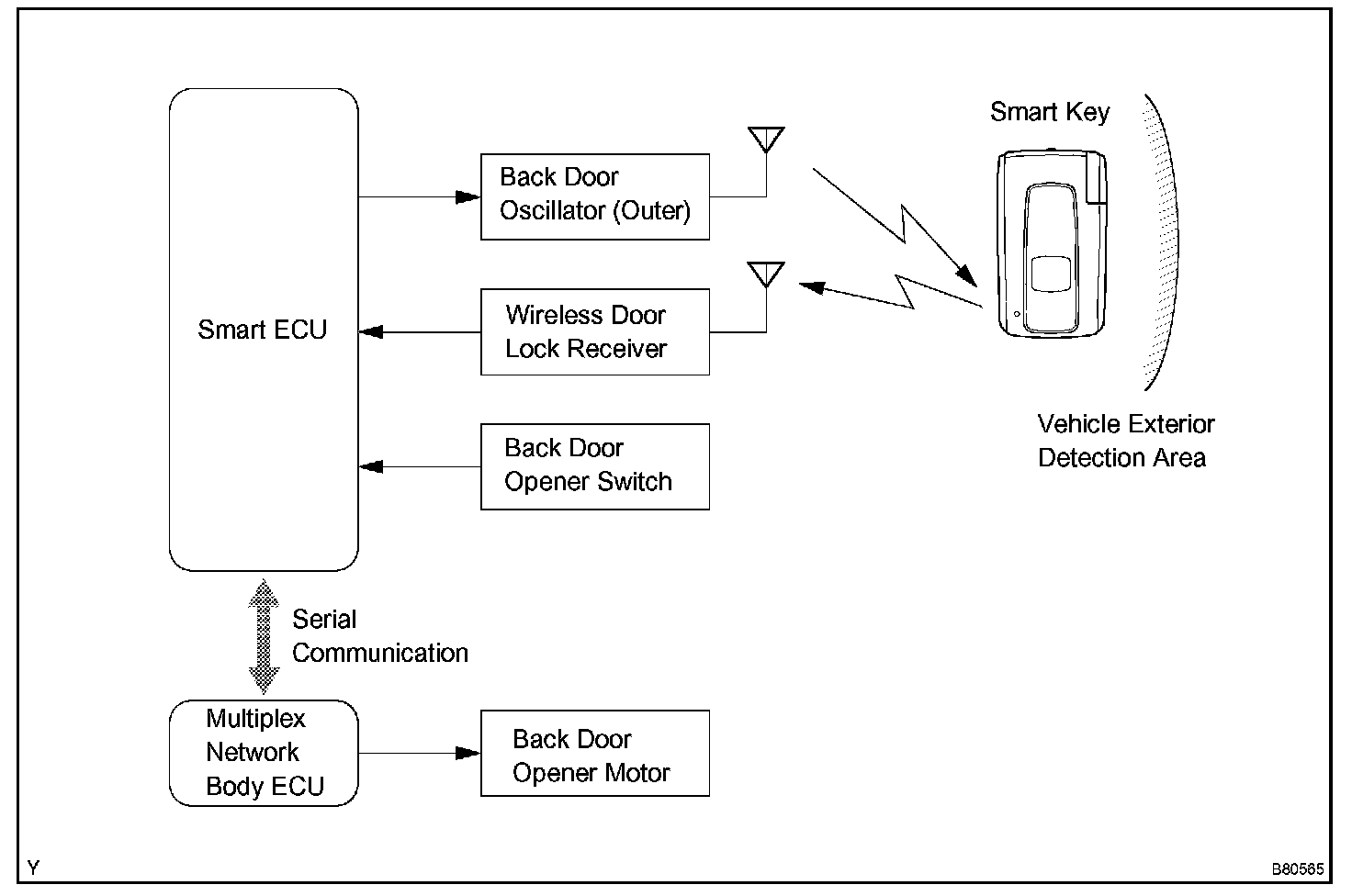 - With all doors locked, if the back door opener switch is pressed with the smart key in the user's possession, the back door oscillator (outer) outputs a smart key detection signal and the smart ECU checks the ID code. After the check is completed, the smart ECU unlocks* the back door via the body ECU. At this time, if the user continues to press the back door opener switch, the back door lock latch will be released.