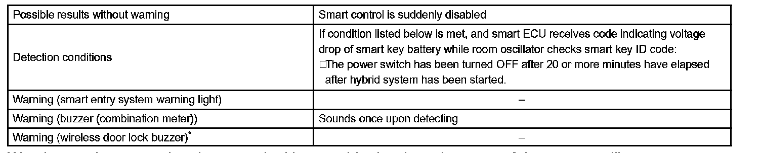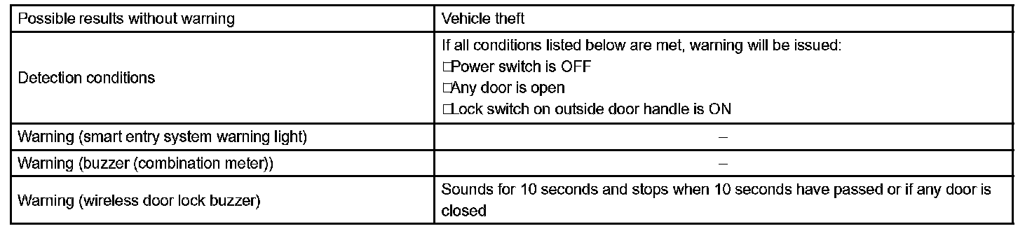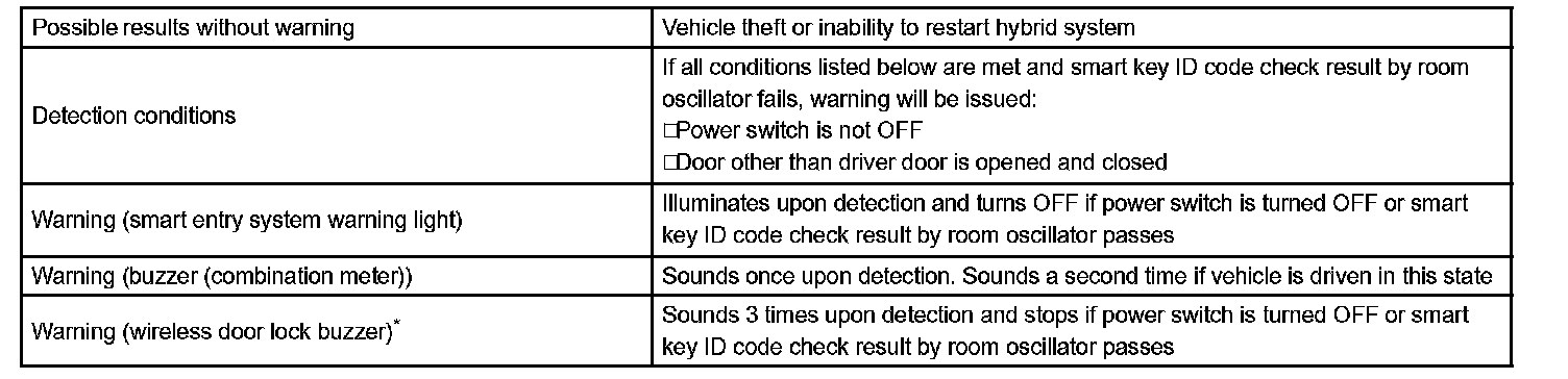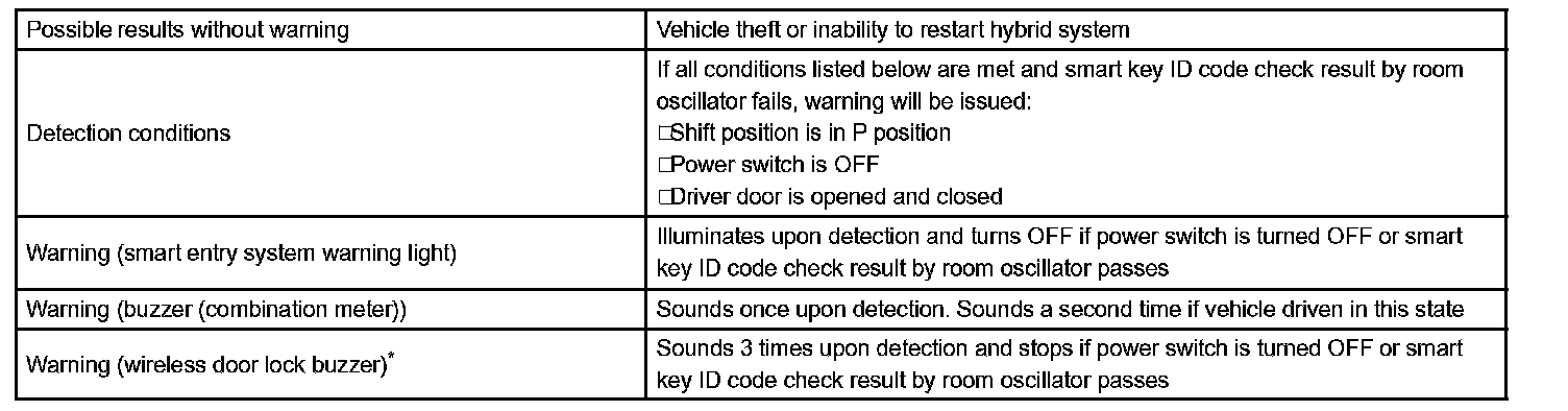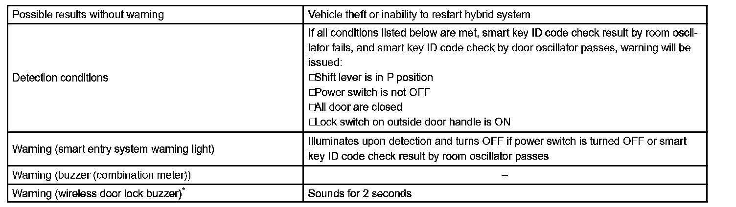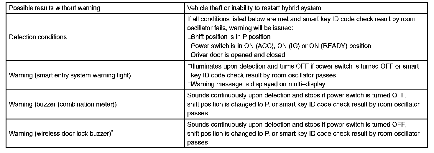 If the above situations occur, the hybrid system may be unable to be started once it has been turned off, the vehicle may be stolen, or other problems may follow. Warning function descriptions for several smart key usage errors are below.