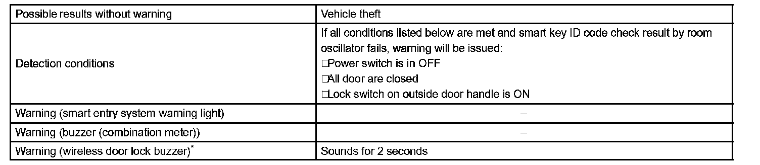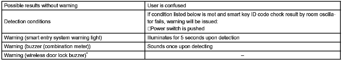The smart key system is equipped with a warning function to prevent problems resulting from errors in smart key usage. The smart key system works without any requirements from the driver other than having the key in one's possession. The driver, as a result, may become unaware of the presence or location of the key and make errors (listed below) that could lead to serious problems.
