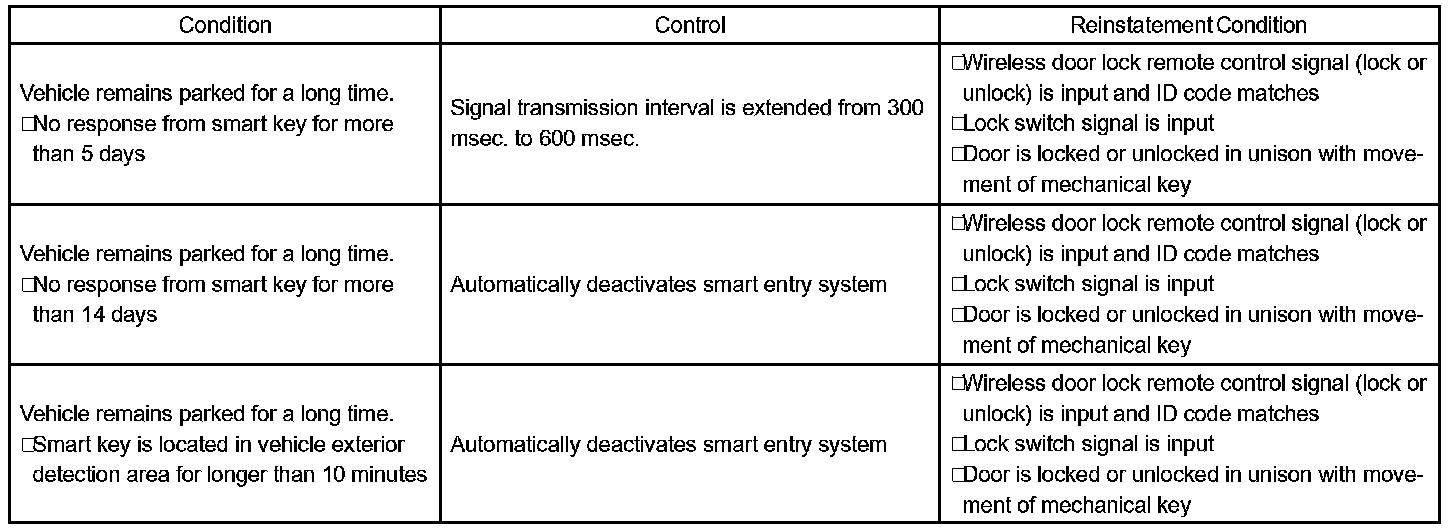 - When the doors are locked, the door oscillators emit signals to the outside of the vehicle at default intervals of 300 msec. To avoid depleting the auxiliary battery, the system has a battery saving function whereby: 1) after 5 days without a response from the smart key, the system extends door oscillator signal intervals to 600msec.; and 2) after 14 days without a response from the smart key, the system deactivates the smart entry system.