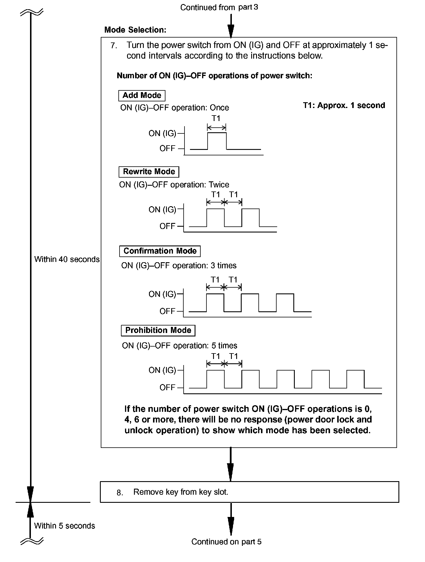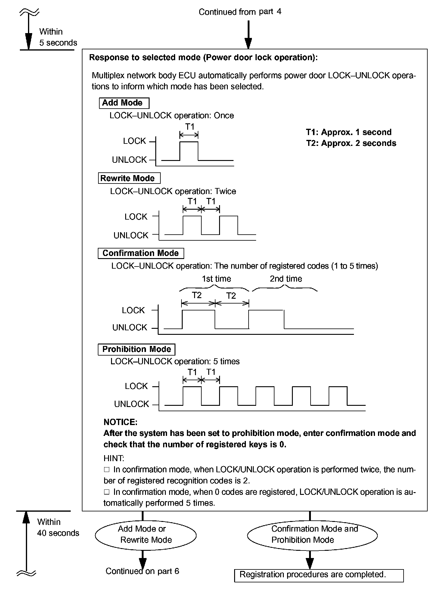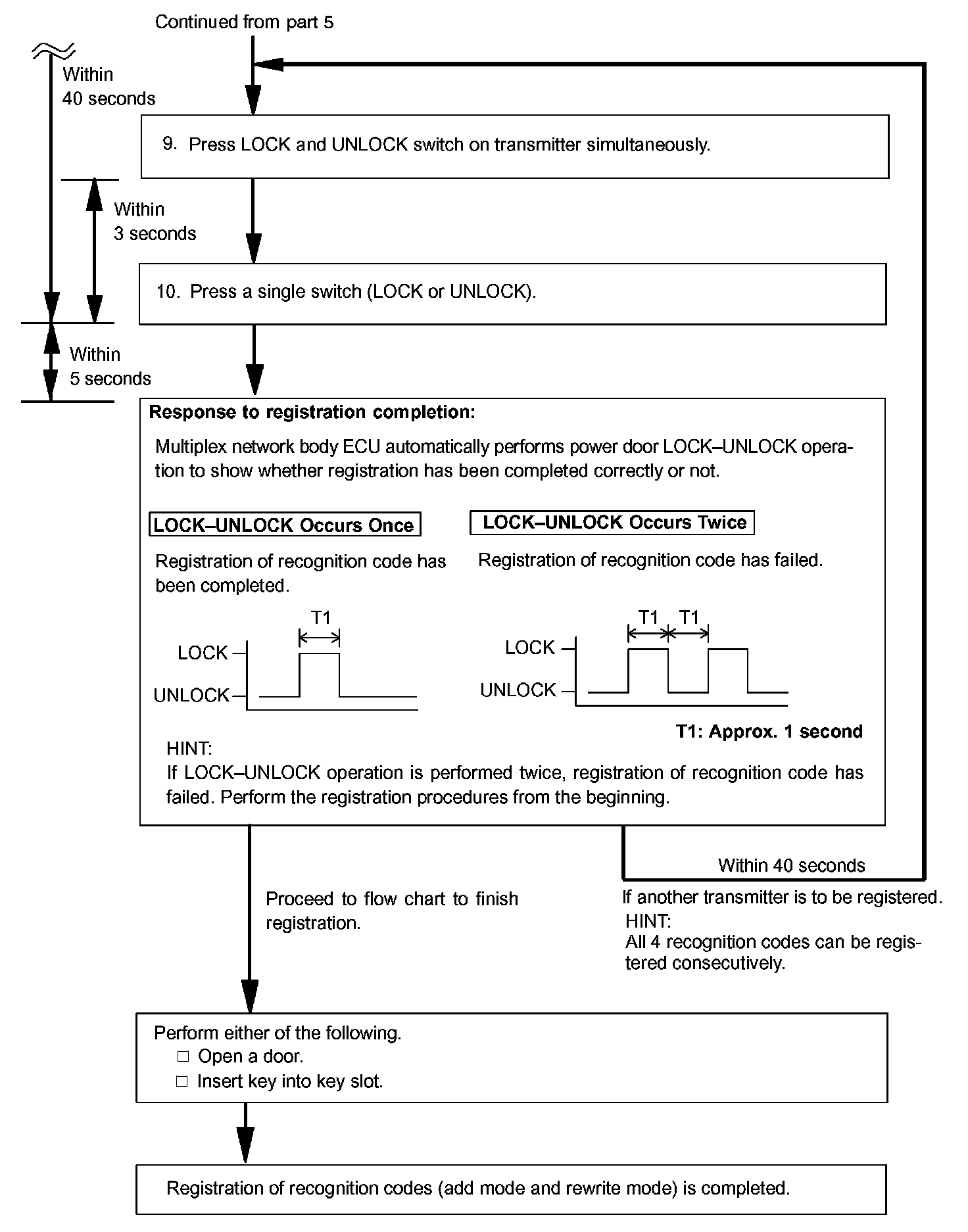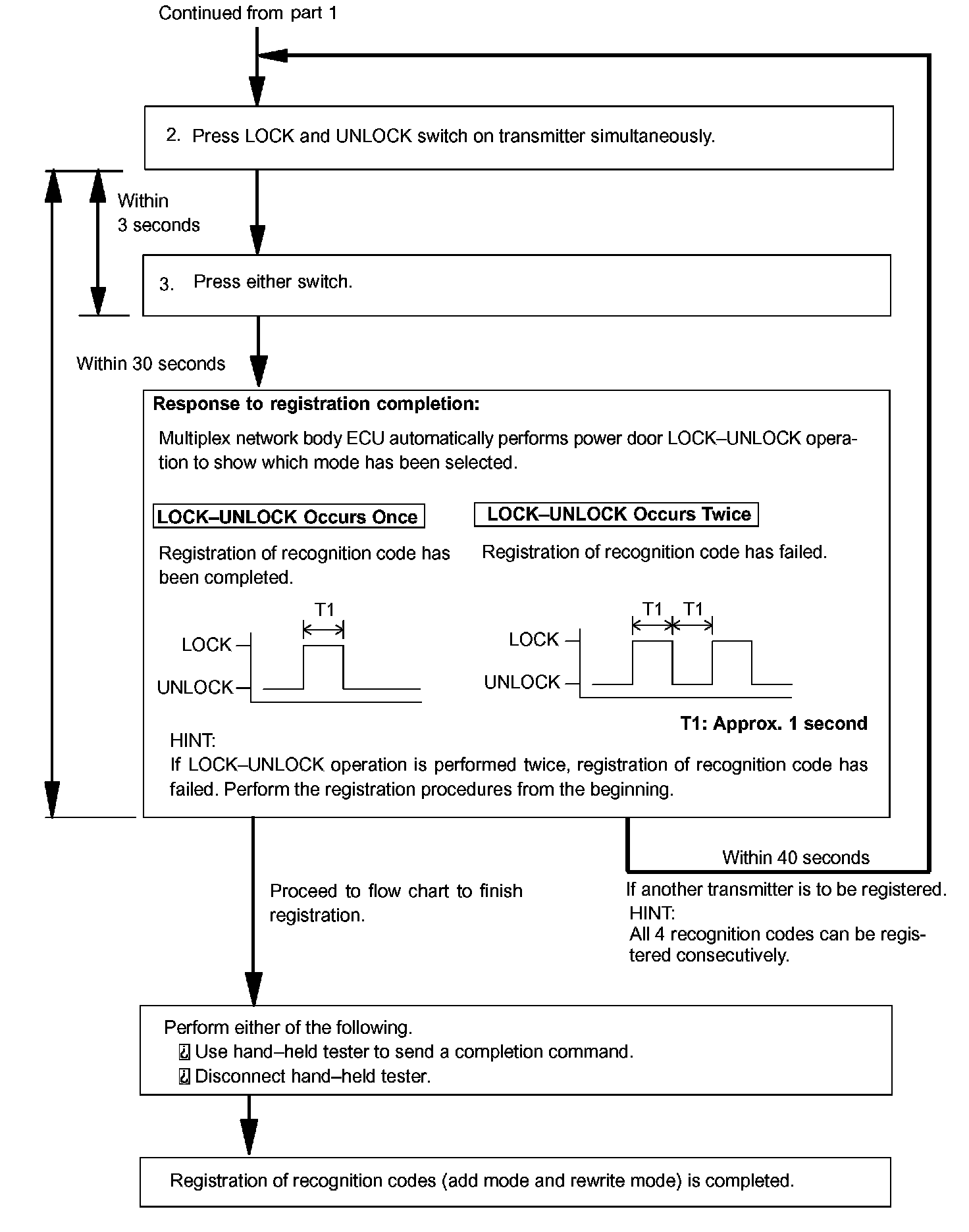 - The add mode is used to register new recognition codes while still retaining codes already registered. This mode is used when a new transmitter is added. If the number of registered codes exceeds 4, the previously registered codes will be erased in order, starting from the first registered code.