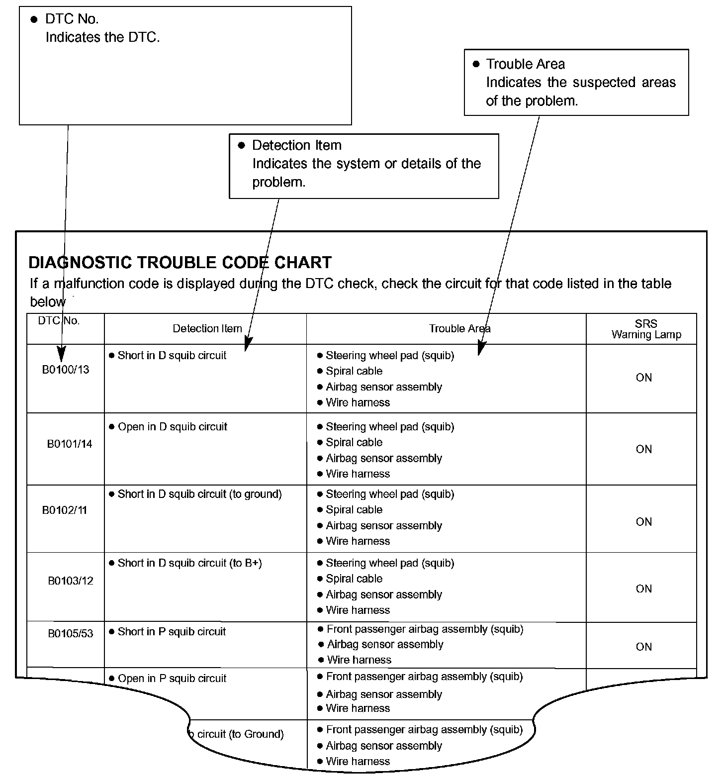 DIAGNOSTIC TROUBLE CODE CHARTUse Diagnostic Trouble Codes (DTCs) (from the DTC checks) in the table to determine the trouble area and proper inspection procedure. The Supplemental Restraint System (SRS) DTC chart is shown as an example.