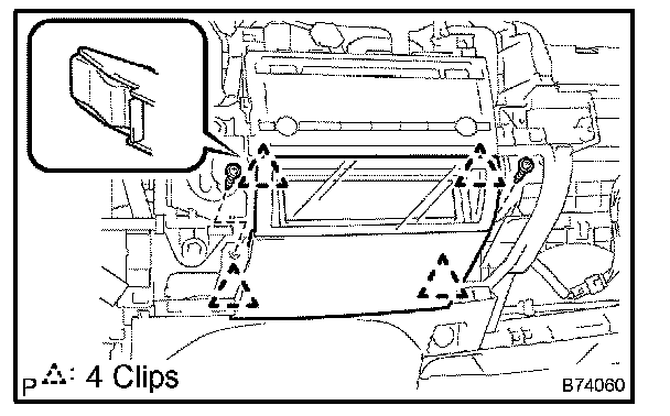 b. Disengage the 4 clips and then remove the instrument cluster finish panel assy center.
