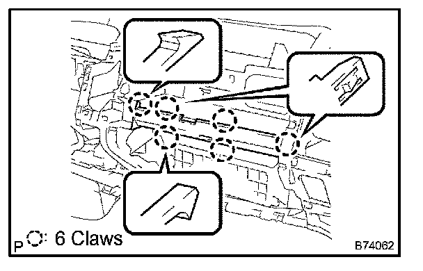 b. Disengage the 4 claws and the 2 clips, and then remove the instrument panel finish panel lower center.