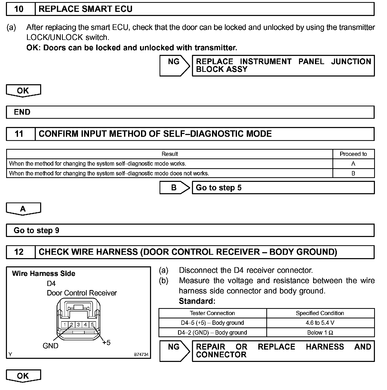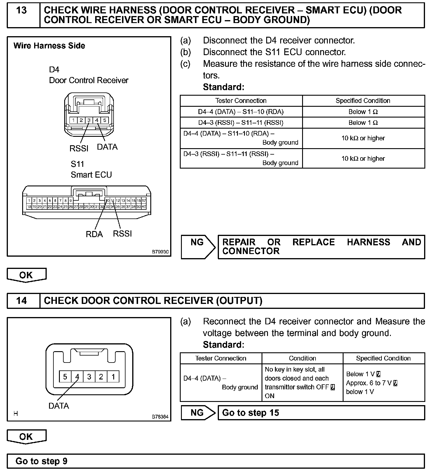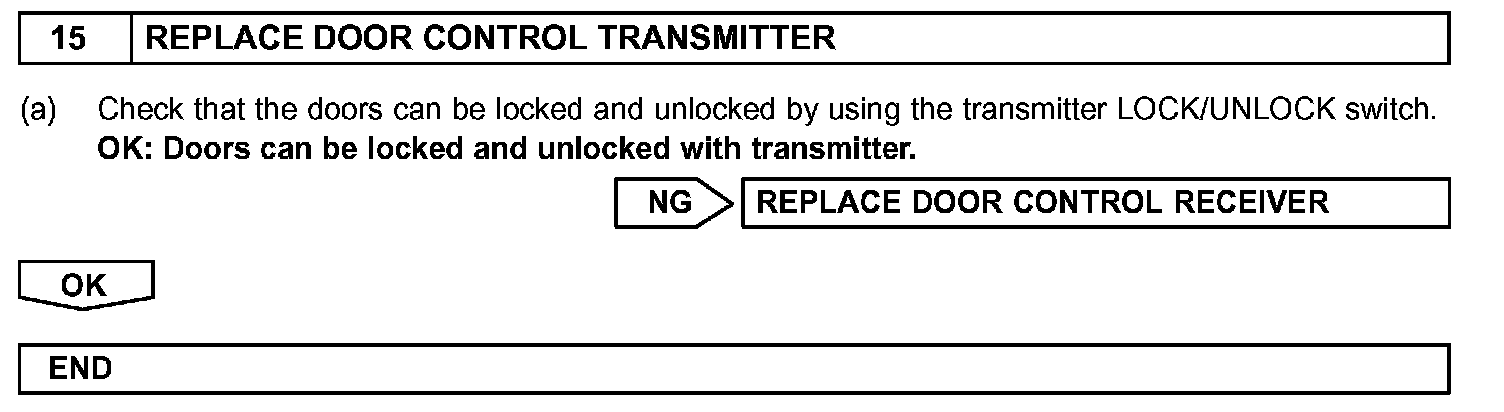 The door control receiver receives signals from the transmitter and sends these signals to the multiplex network body ECU through the smart ECU. The multiplex network body ECU then controls all doors by sending LOCK/UNLOCK signals to each door lock actuator.