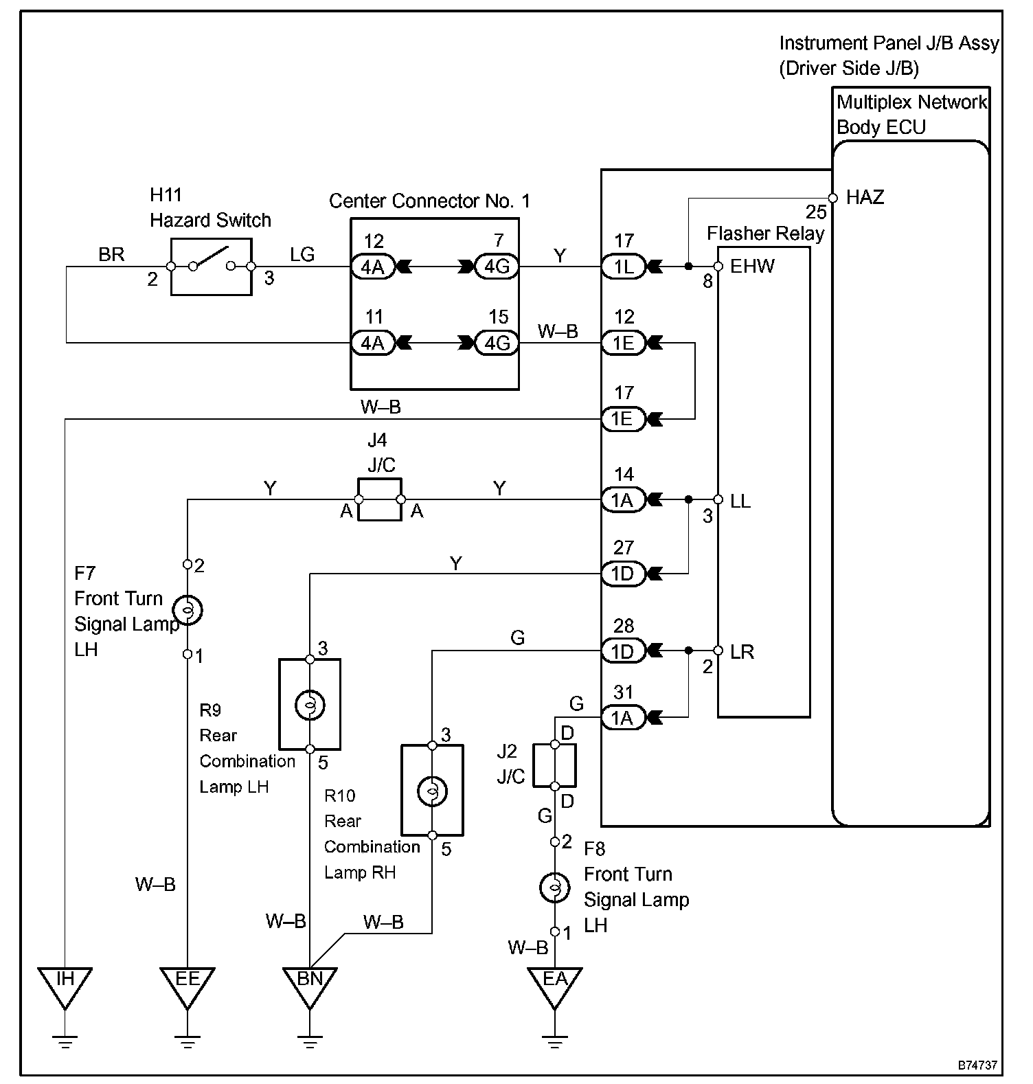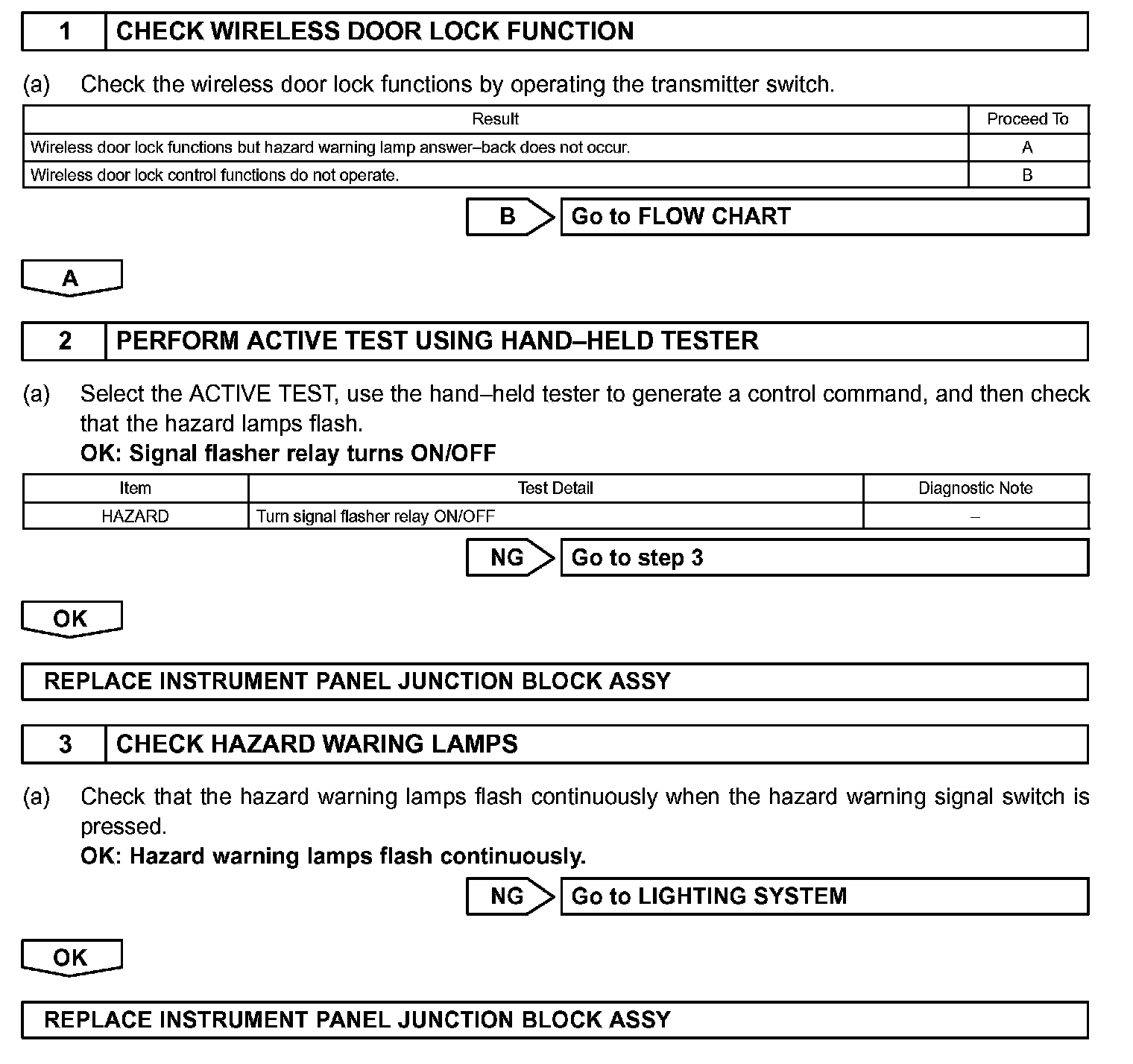 In some cases, wireless control functions are normal but the hazard warning lamp is not. In such cases, the multiplex network body ECU's hazard warning lamp signal outputs may be malfunctioning.