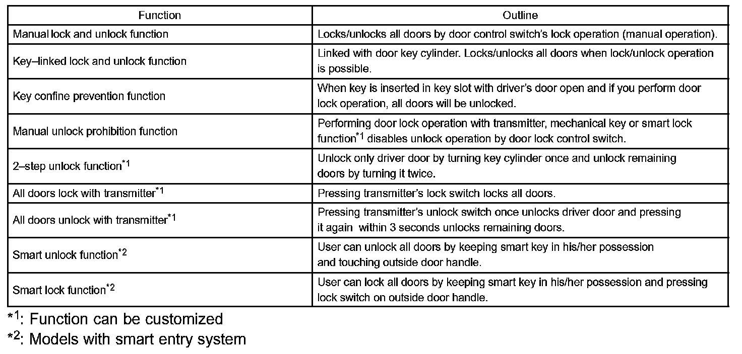 Operating the driver side door lock using a key sends lock/unlock request signals to the door lock control relay. The driver side door key-linked lock function has an optional unlock method called the "2-step unlock function".