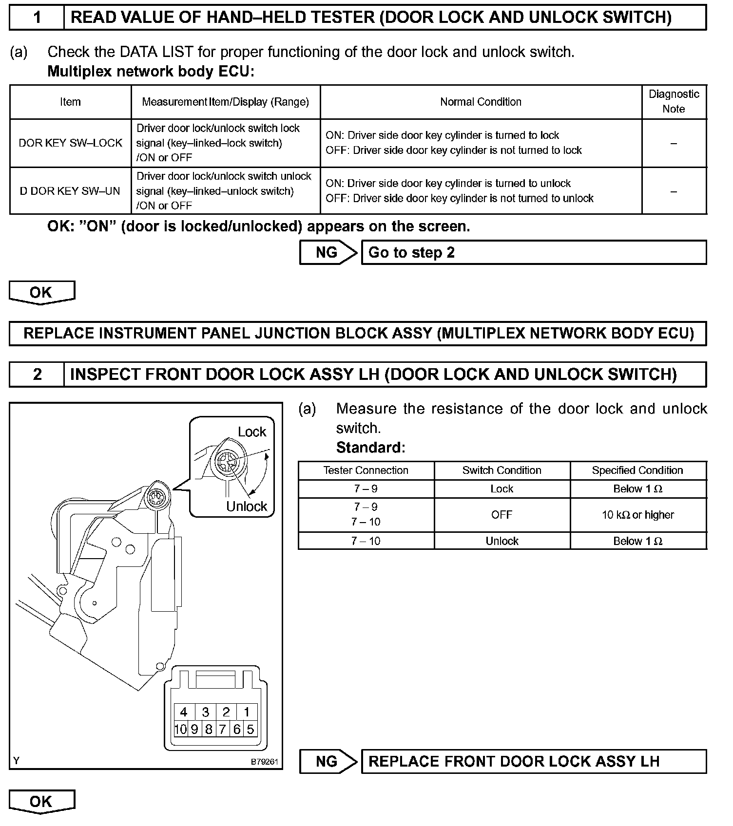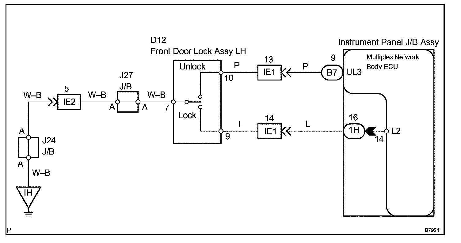 The instrument panel J/B assy (multiplex network body ECU) receives switch signals from the door-key- linked lock/unlock switch and activates the door lock motor according to the signals.
