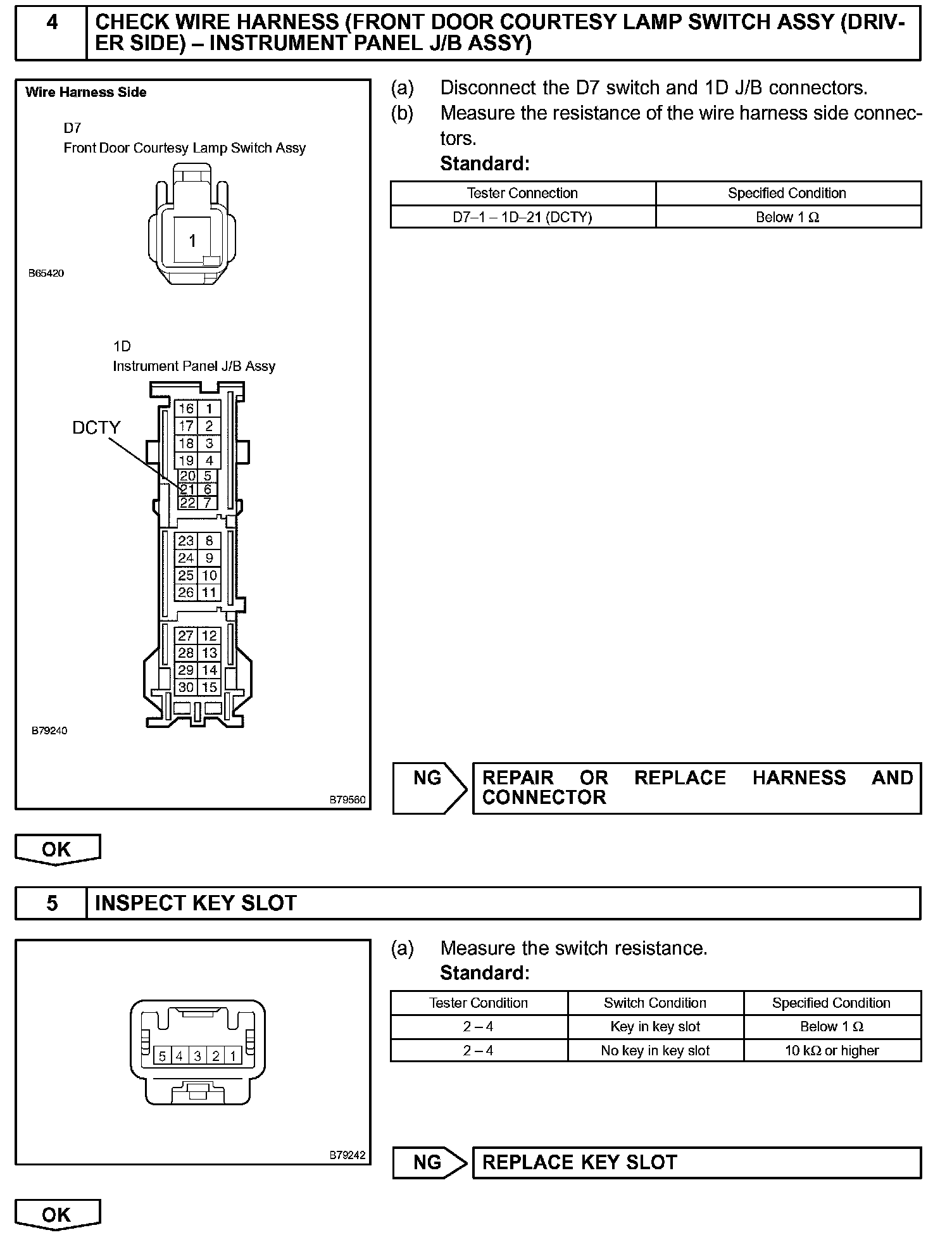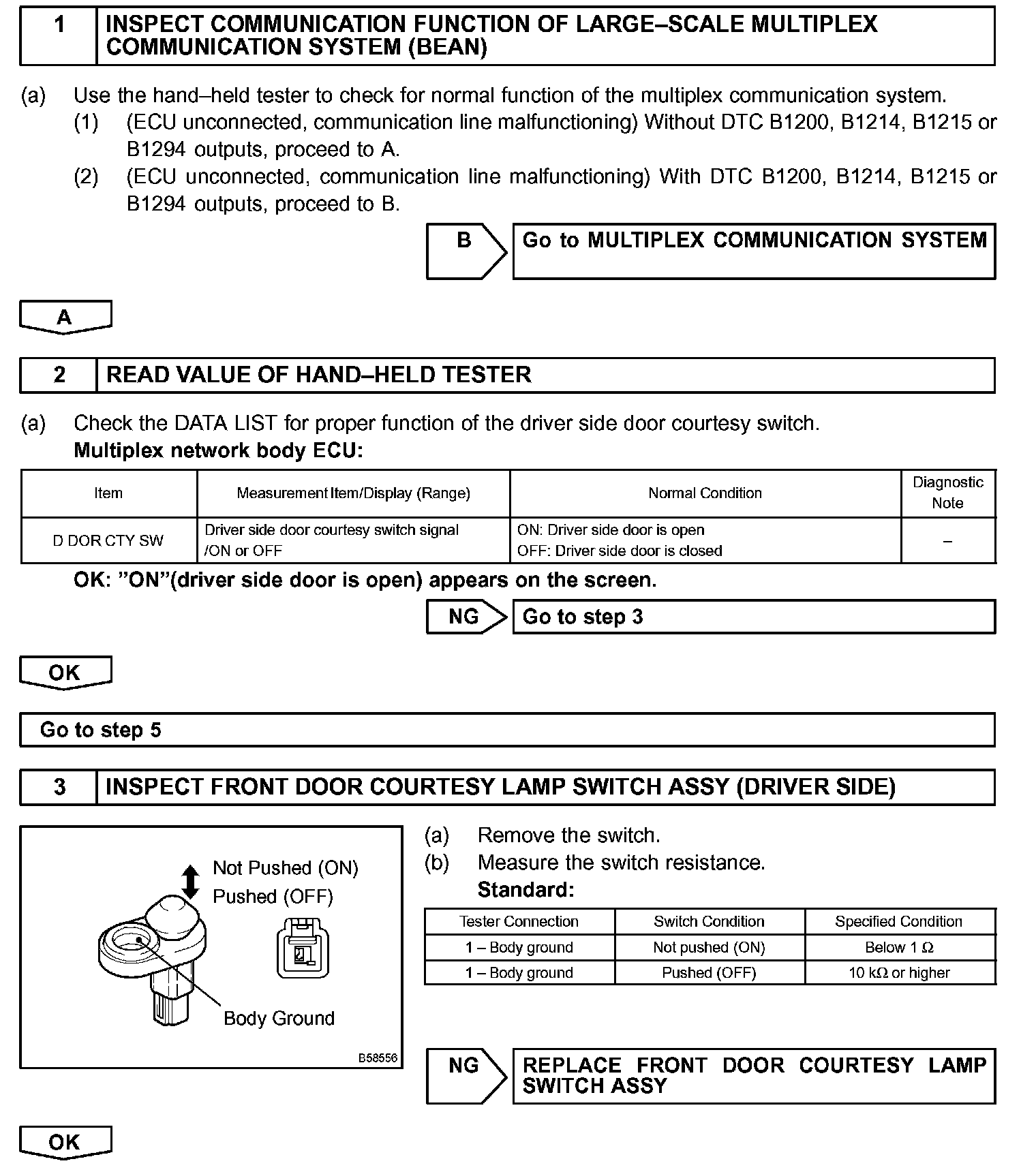 To prevent the key from being locked in the vehicle, the door control relay assembly prevents doors from being locked by monitoring two switches: 1) the unlock warning switch, which turns ON when the key is inserted into ignition key cylinder; and 2) the driver side courtesy lamp switch, which turns ON when the driver