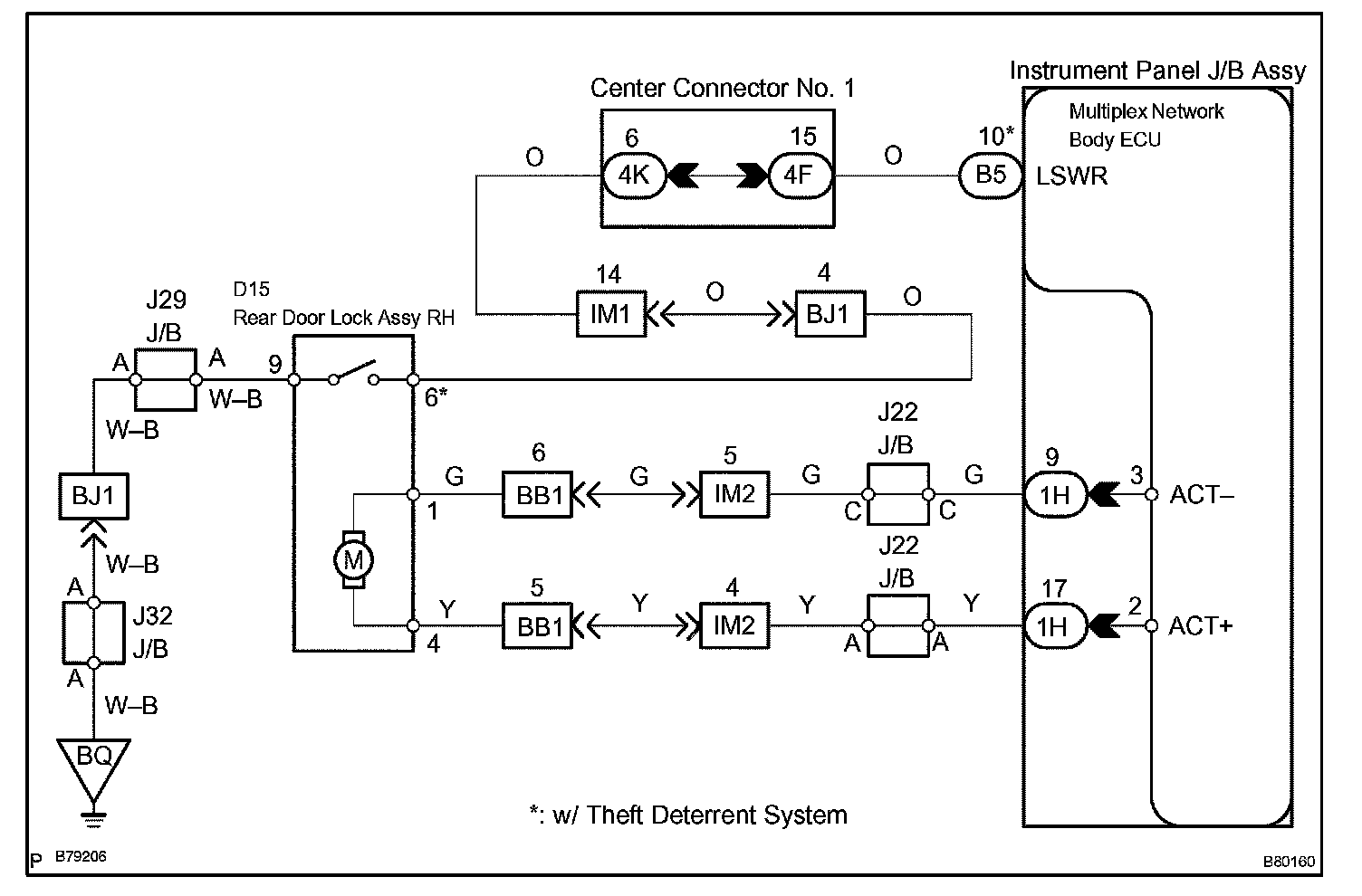 The instrument panel J/B assy (multiplex network body ECU) receives lock/unlock switch signals and activates the door lock motor according to the signals.