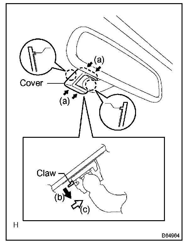 b. While holding down the claw in the direction of the arrow labeled (b), slide the inner rear view mirror in the direction of the arrow labeled (c) and remove it.