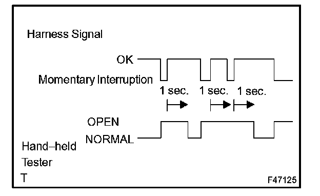 - The OPEN display on the hand-held tester remains on for 1 second after the harness signal changes from momentary interruption (open circuit) to normal condition.