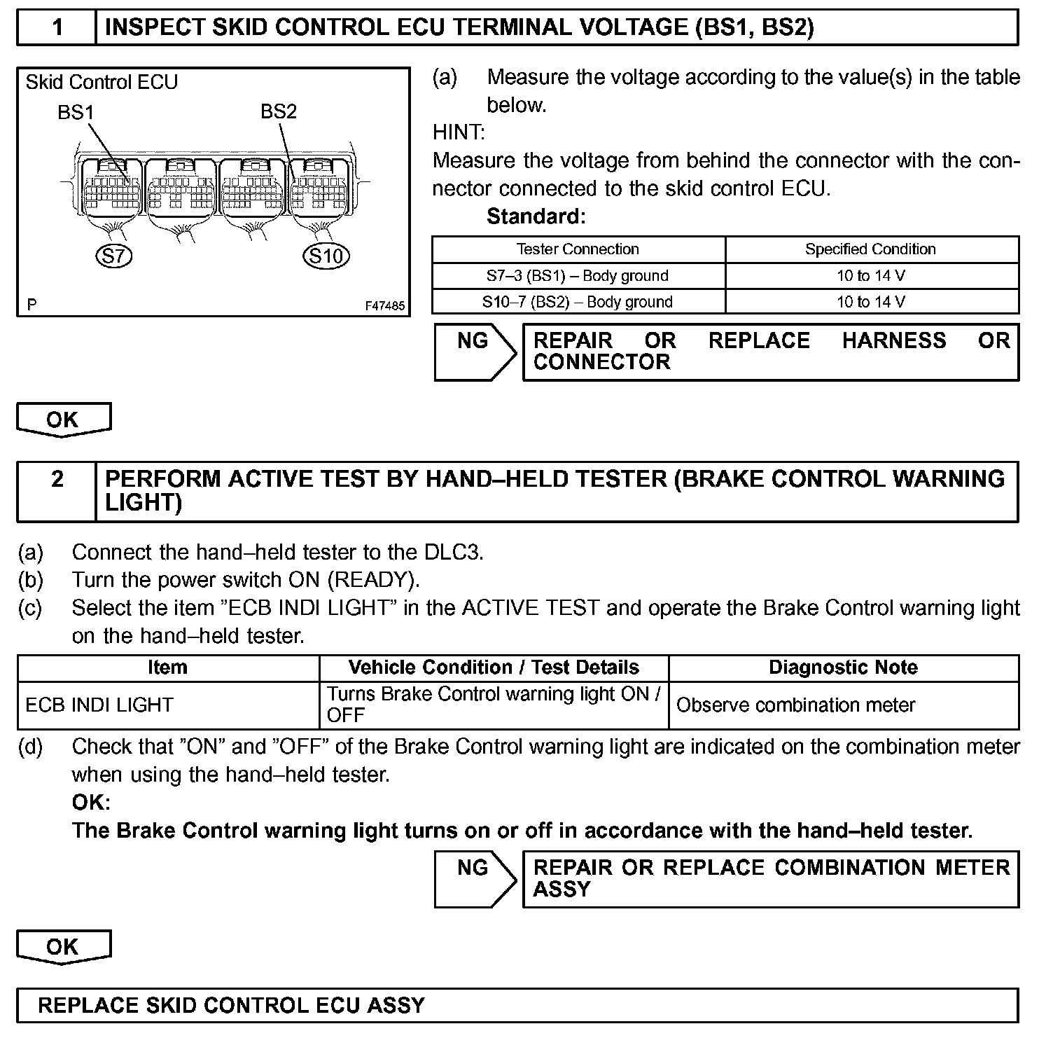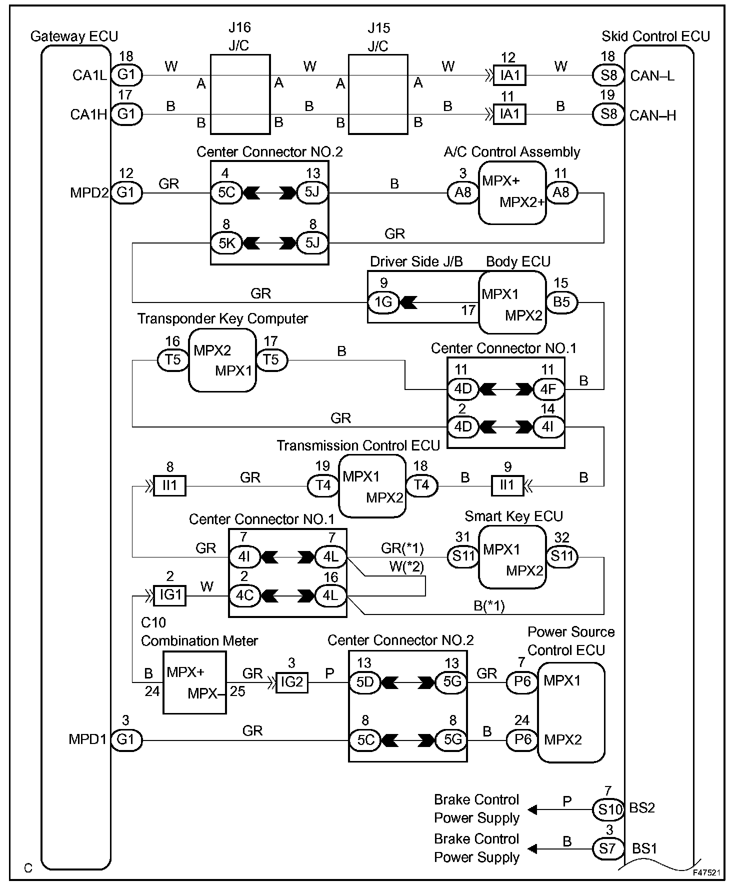 The skid control ECU is connected to the combination meter via CAN and Multiplex communications. Informs the driver when there is trouble with ECB or a problem with the brake system that has no influence on driving, by turning on.