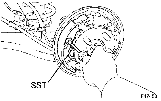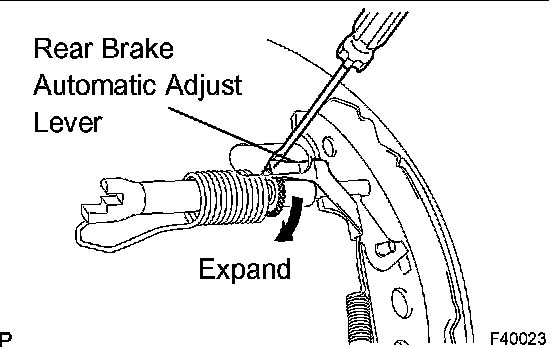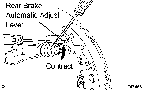 HINT: If the rear brake drum sub-assy cannot be removed, push the rear brake automatic adjust lever through the backing plate service hole using a screwdriver. Turn and contract the adjuster using another screwdriver.