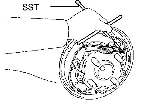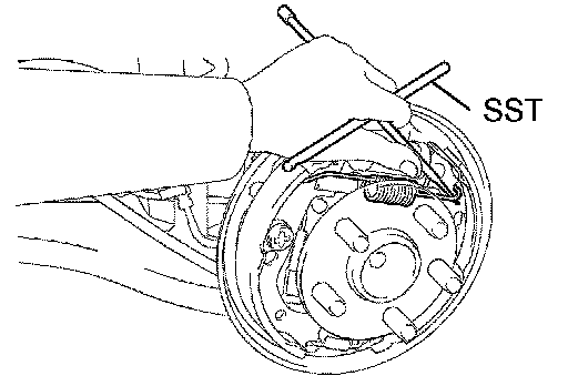 a) Using SST, connect the shoe return spring to the front brake shoe and rear brake shoe.