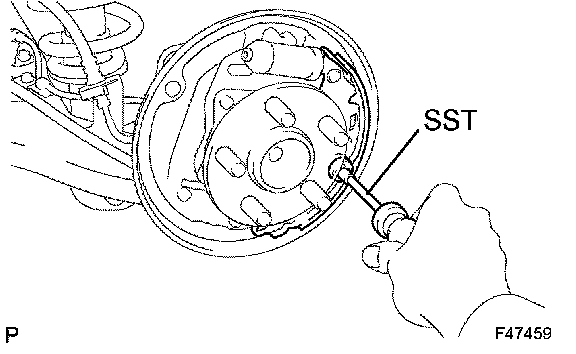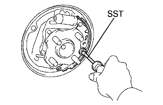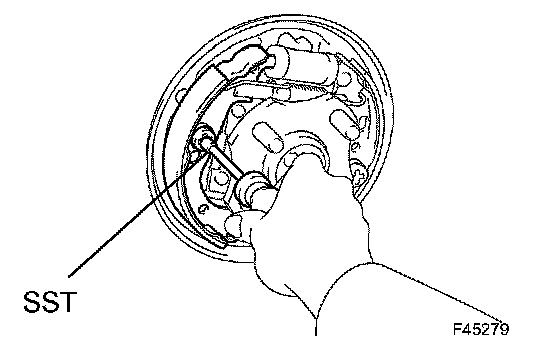 b) Using SST, install the rear brake shoe, the pin, the shoe hold down spring and the shoe hold down cup.