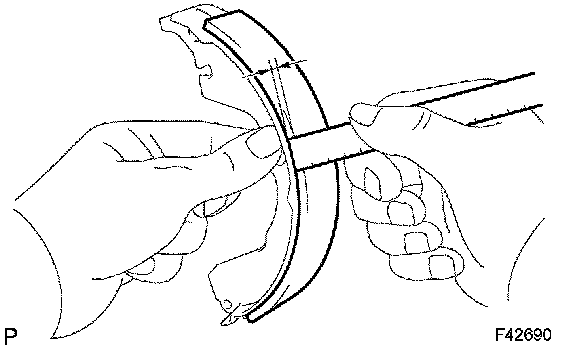 If the lining thickness is at the minimum thickness or less, or if there is severe or uneven wear, replace the brake shoe.