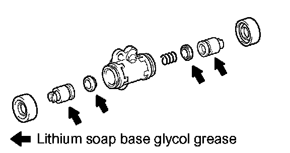 a) Apply lithium soap base glycol grease to 2 new wheel cylinder cups and 2 pistons.