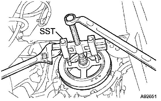a. Using SST, hold the crankshaft damper and loosen the crankshaft bolt.