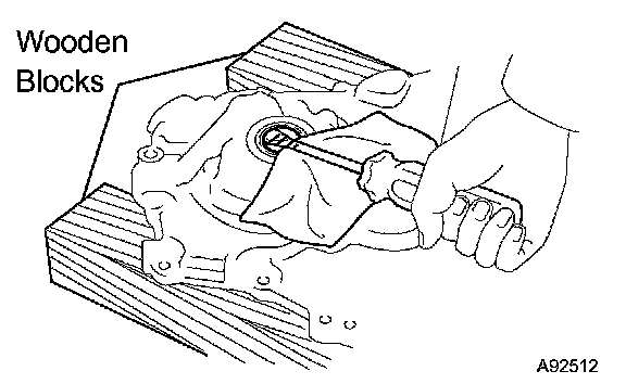 c. Using a screwdriver with its tip wrapped in tape, remove the oil pump assembly by prying out between the cylinder head and cylinder block.
