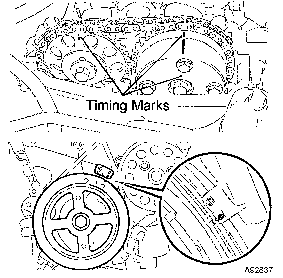 2. Check that the timing marks of the camshaft timing gear are located as illustrated.