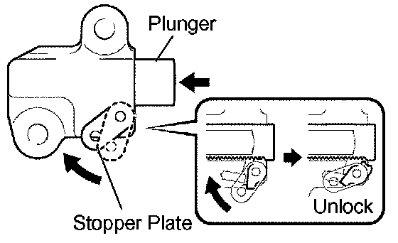 HINT: If the stopper plate is not completely lifted down and a 3.0 mm (0.118 inch) diameter bar cannot be inserted, unlock and pull out the plunger slightly. The stopper plate will be completely lifted down and a 3.0 mm (0.118 inch) diameter bar can be inserted easily.