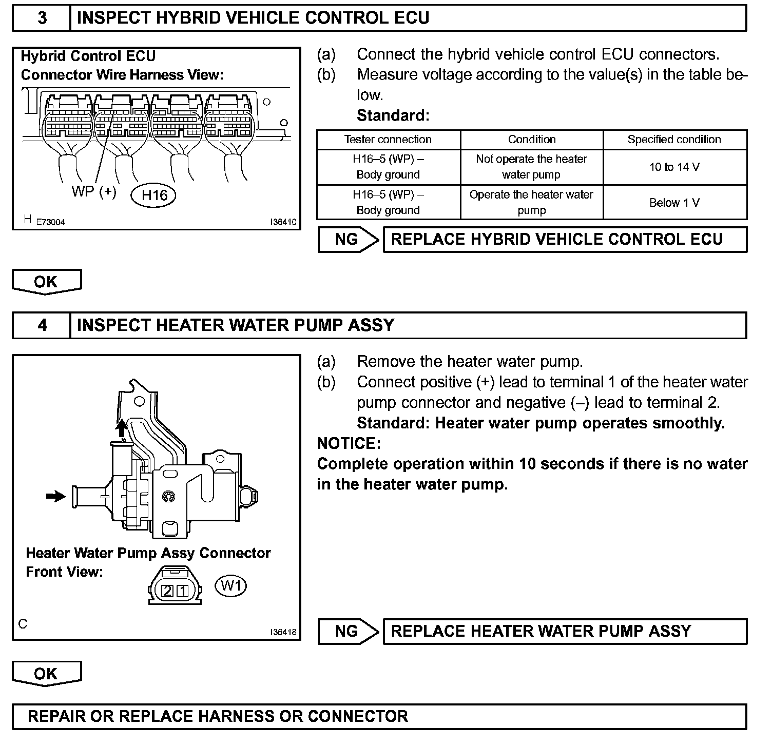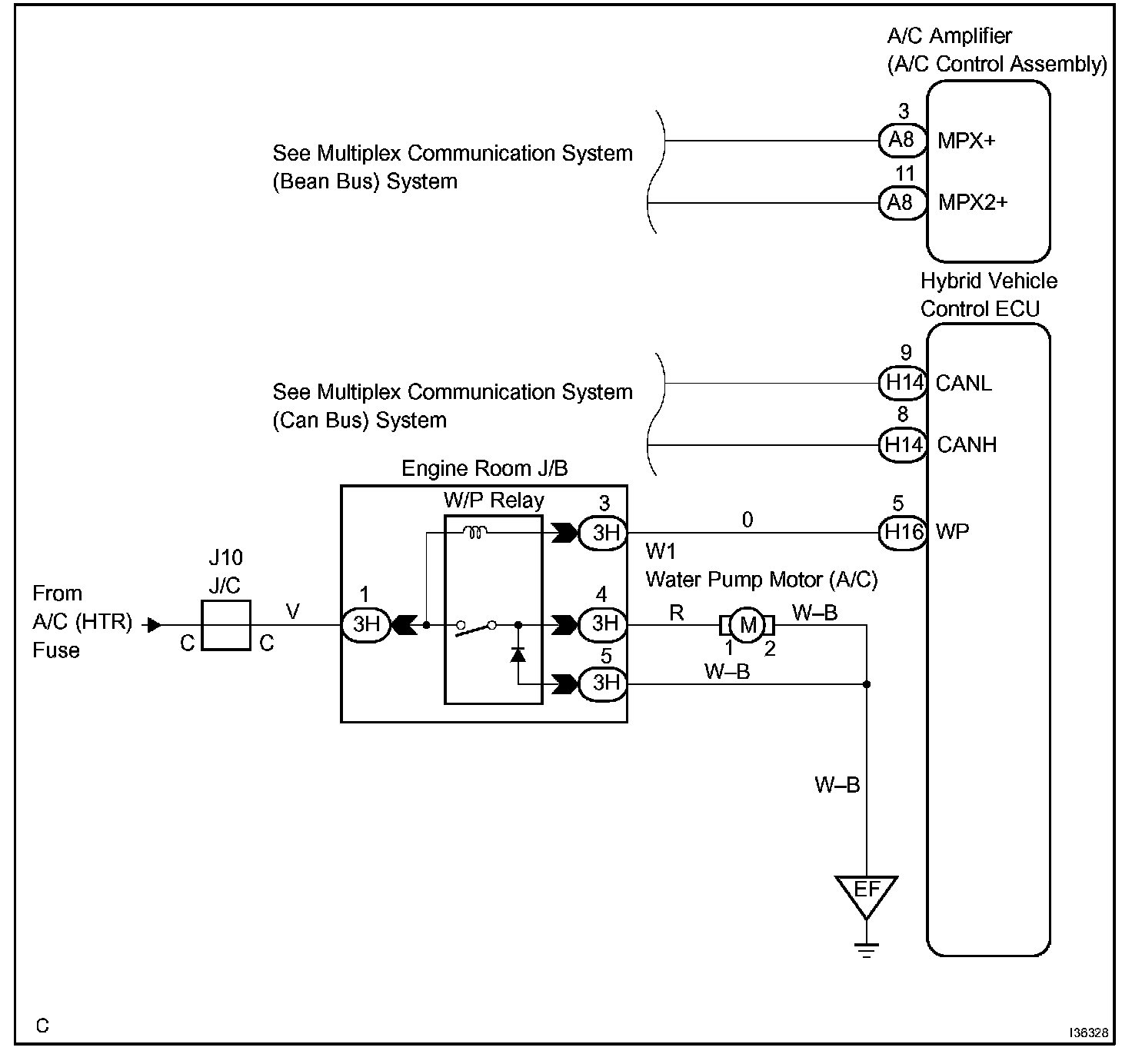 Directed by the air conditioner amplifier assembly, Hybrid control ECU operates the water pump relay and drives the heater water pump assembly.