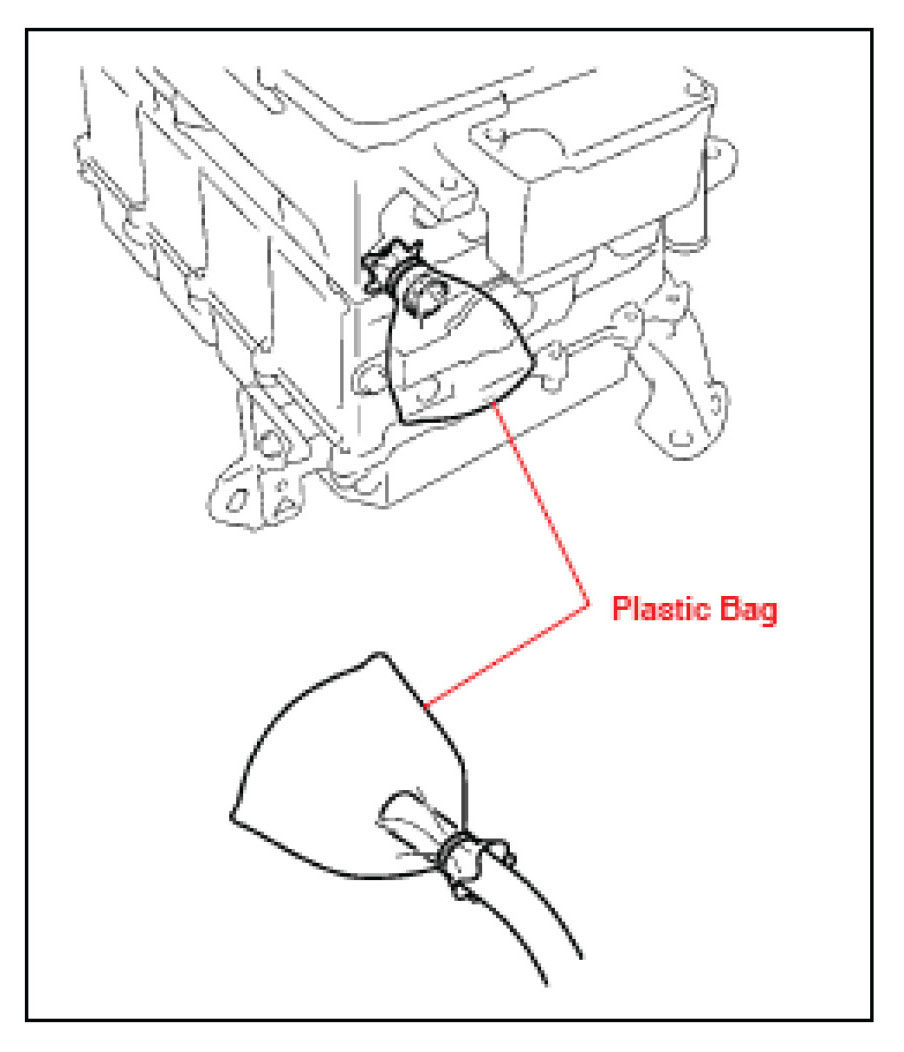 5. Due to its internal structure, some coolant will remain in the inverter after draining the cooling system. Before removing it from the vehicle, cover the inverter fittings AND rubber hoses to prevent any coolant from spilling out. If a suitable cap/plug is not available, use a plastic bag or the finger of a latex glove as shown.