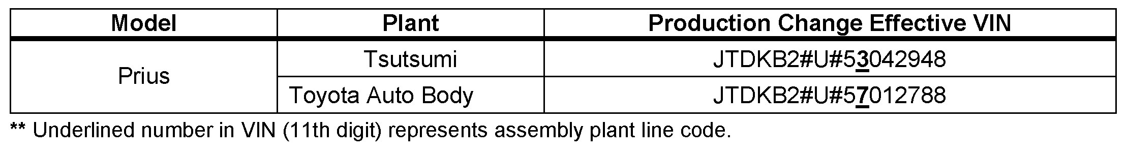 - 2005 model year Prius vehicles produced BEFORE the Production Change Effective VINs shown below.