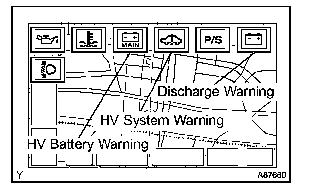 DIAGNOSIS SYSTEMThe HV control ECU has a self-diagnosis system. If the computer, hybrid vehicle control system or the components are not working properly, the ECU carries out a diagnosis to detect the malfunction, and illuminates the master warning lamp in the combination meter together with any of indicators on the multi-information display, the HV system warning, the HV battery warning or the discharge warning.