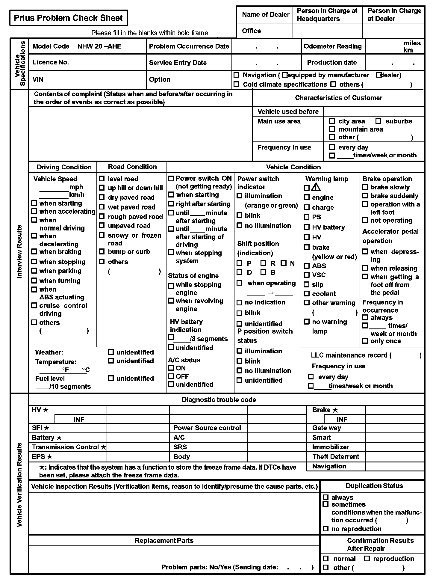 Prius Problem Check Sheet: