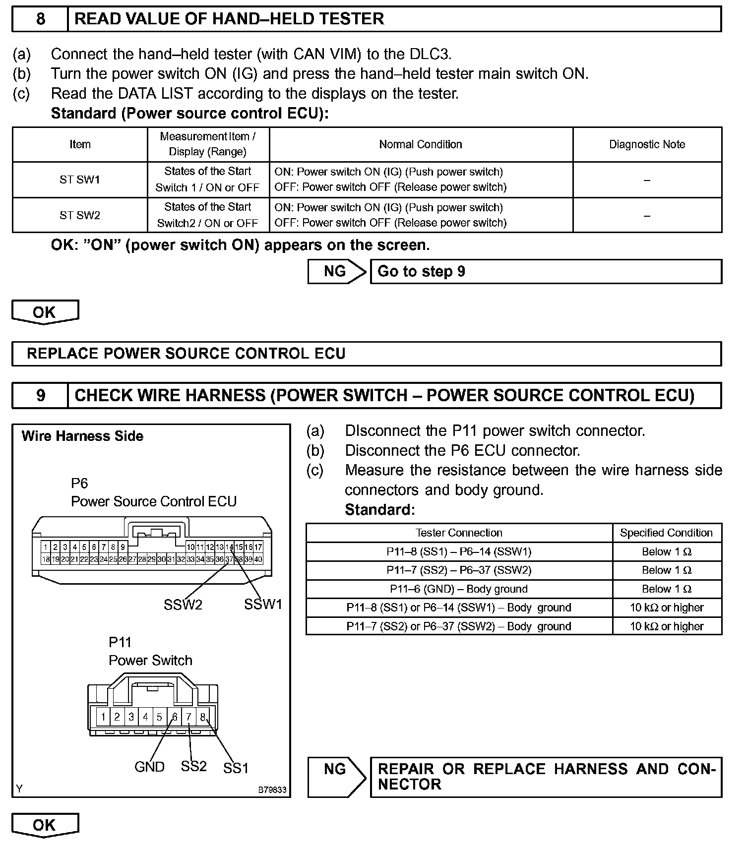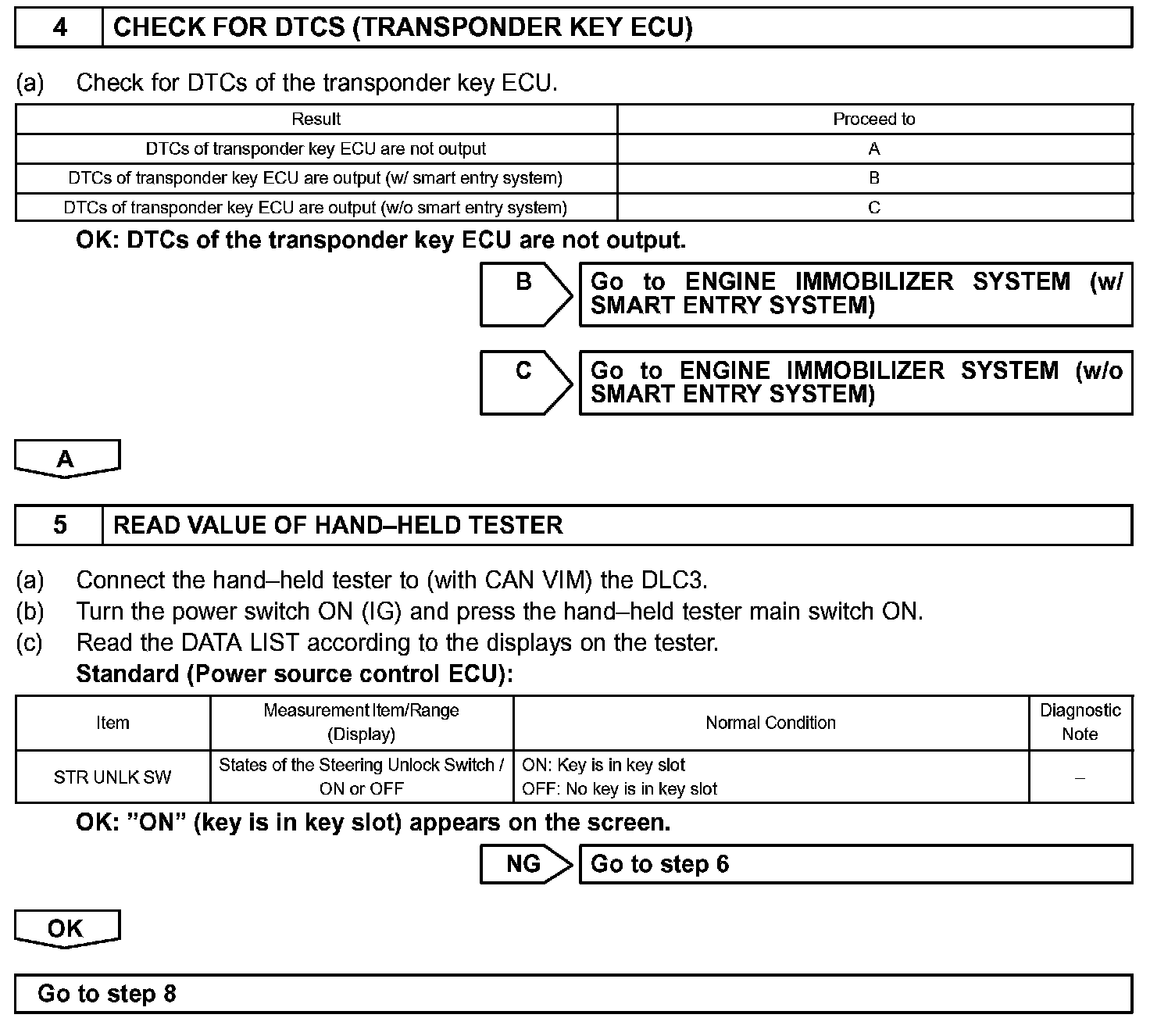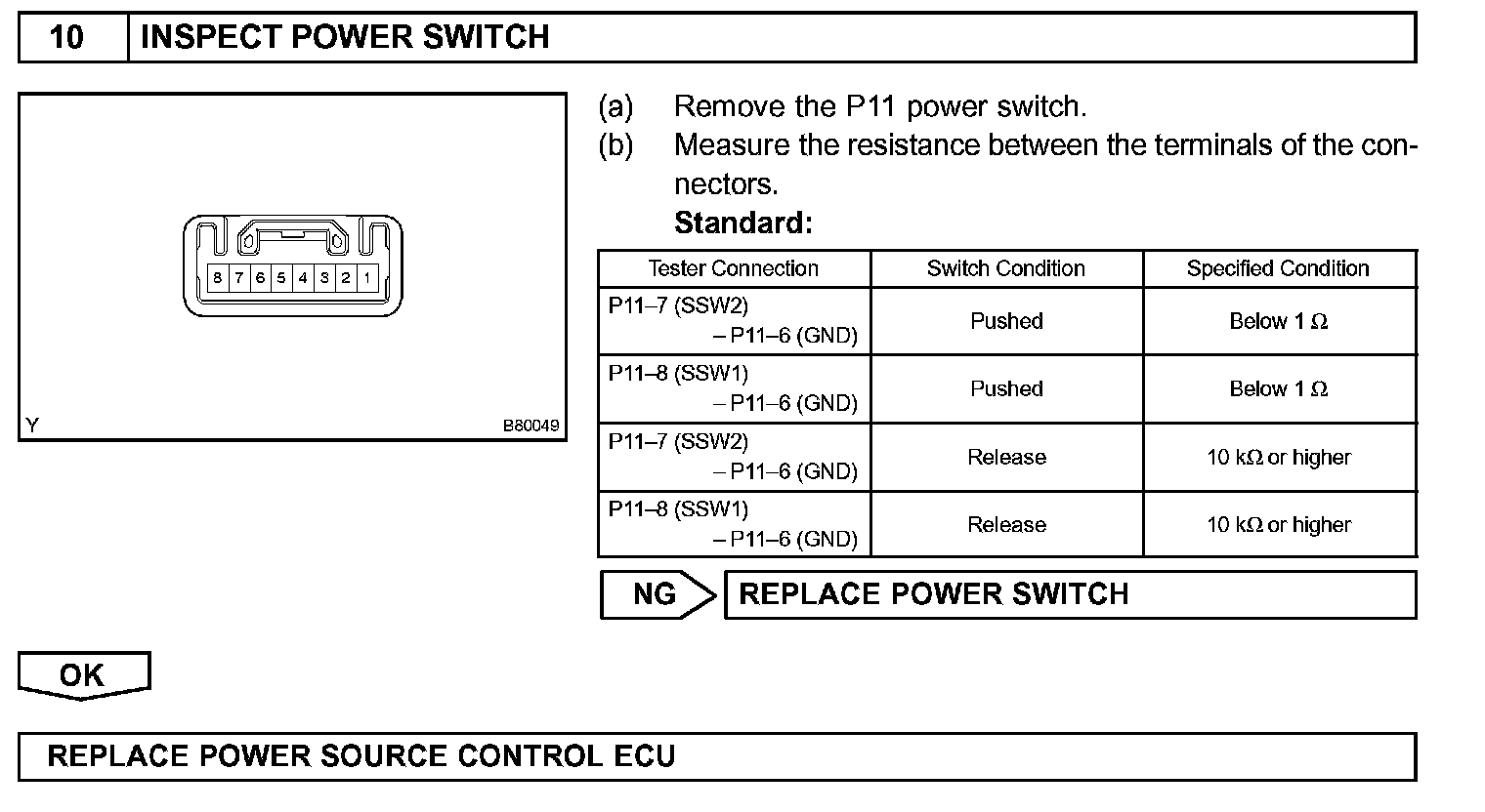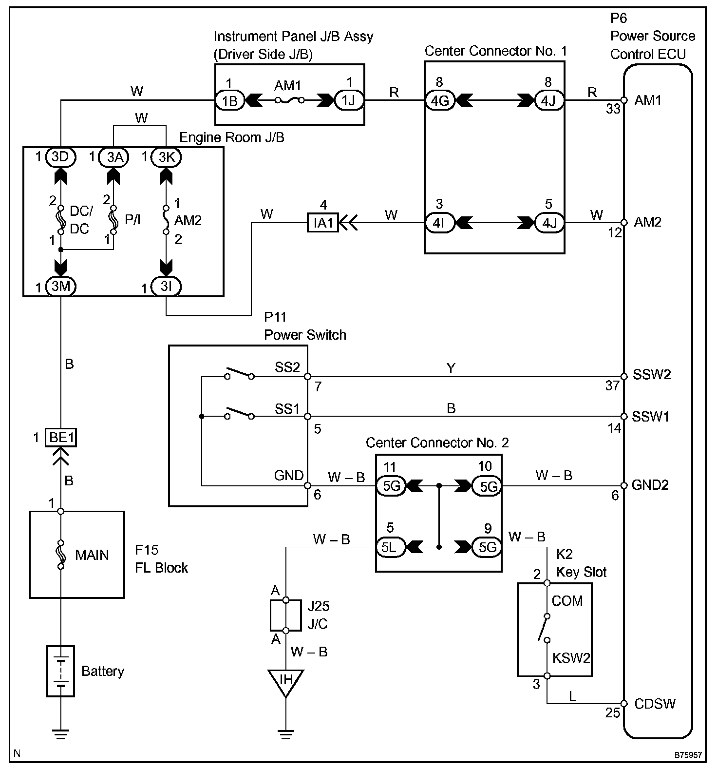 When the key is inserted into the key slot and the power switch is pressed, signals are input to the power source control ECU and power switch mode changes to OFF, ON(IG) or ON (ACC) according to the inputs.