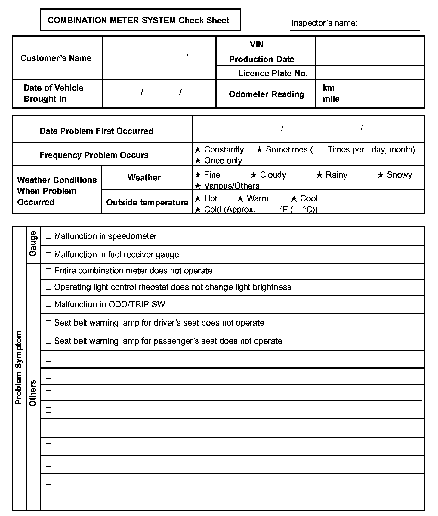 Combination Meter System Check Sheet: