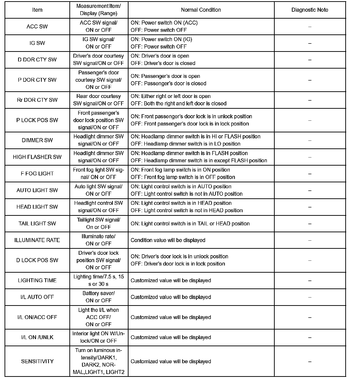 DATA LISTHINT: Values of the switch, sensor or actuator can be read by using the DATA LIST displayed on the hand-held tester without removing any parts. Reading the DATA LIST as the first step of troubleshooting is one of the methods to shorten labor time.