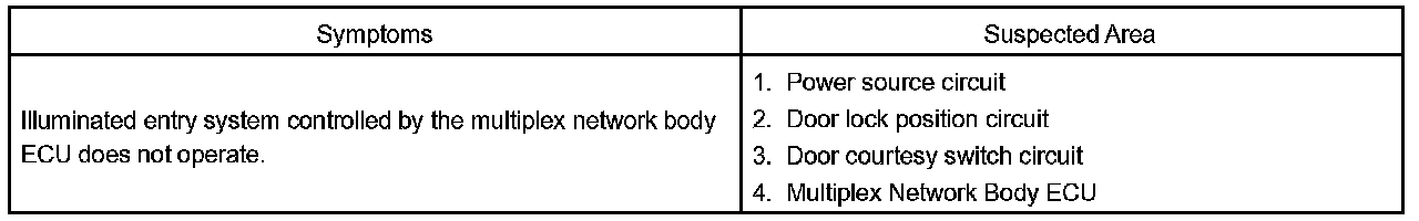 HINT: Inspect the fuse and relay before confirming the suspected area as shown in the charts. Inspect each malfunction circuit in numerical order for the corresponding symptom. If the malfunction still exist even after checking and confirming that all the circuit are normal, replace the ECU.
