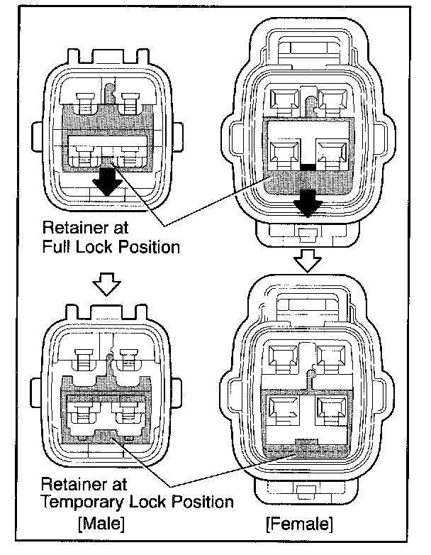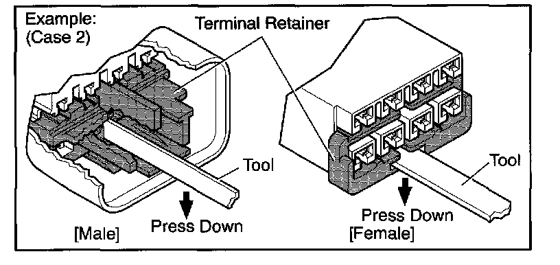 Insert the special tool into the terminal retainer access hole ([]Mark) and pull the terminal retainer up to the temporary lock position.