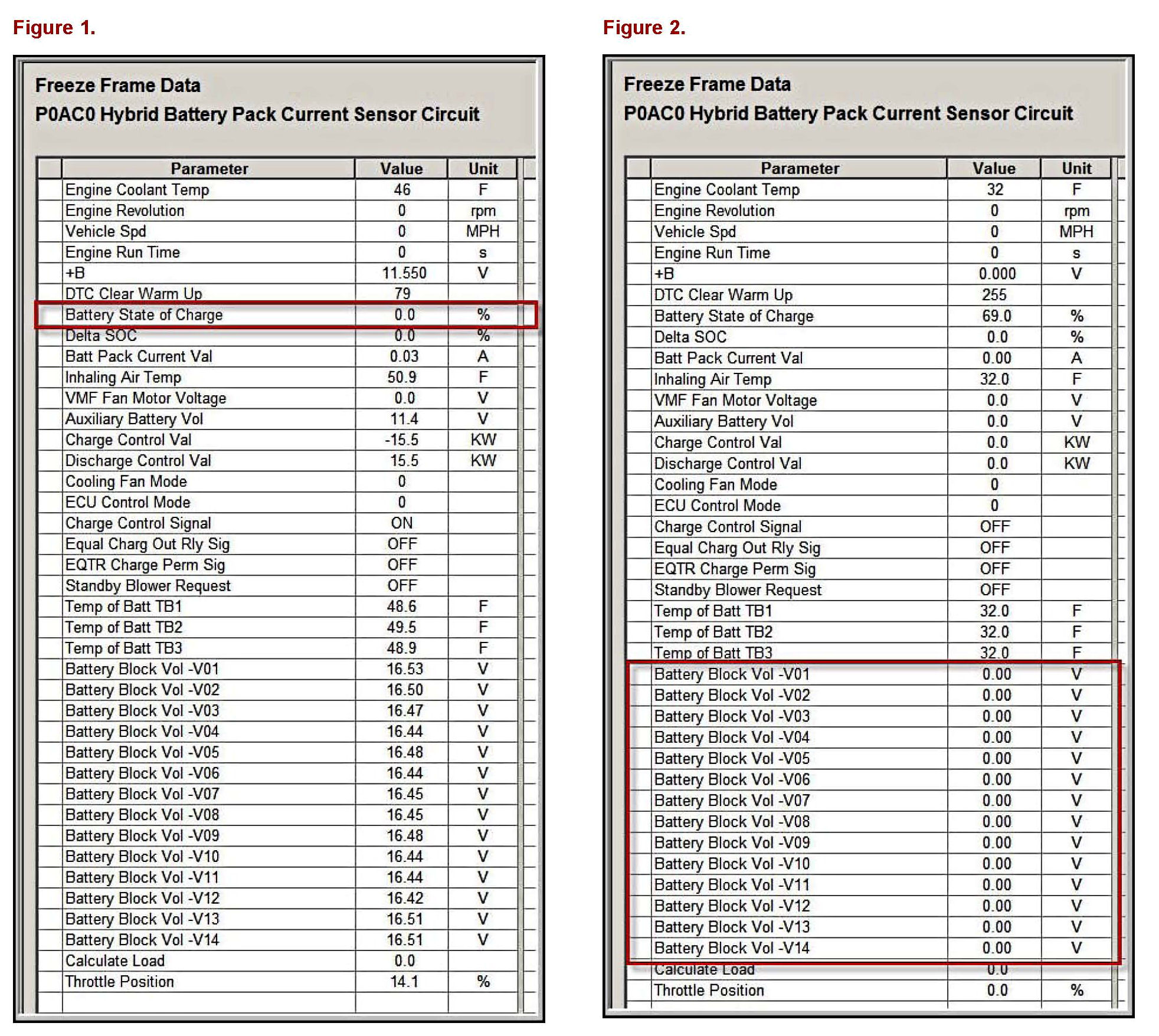 3. Review the Freeze Frame Data (FFD) for P3000 (Information Code 123) P0AC0, P0A1F, P0A7F or P0AFA DTC(s). Inspect the Battery State of Charge (Figure 1) and Battery Block Voltages 1-14 (Figure 2).