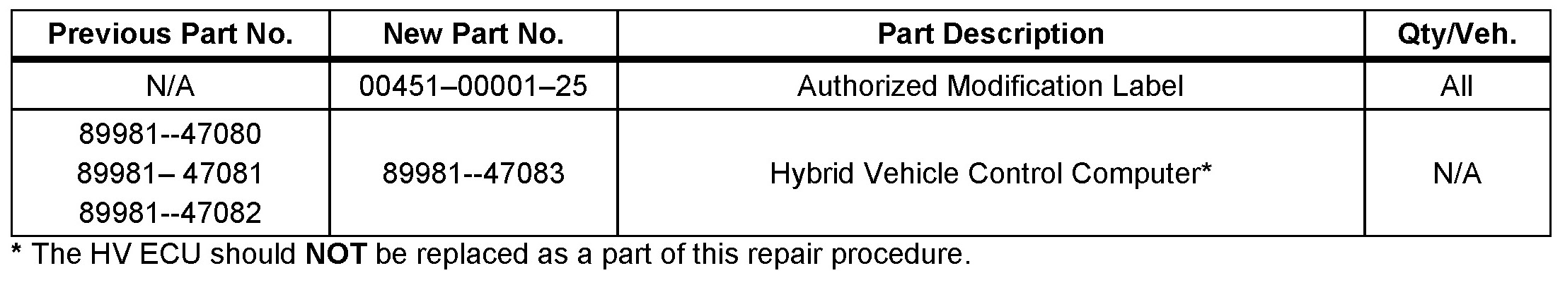 The HV ECU calibration has been revised to prevent a number of potential conditions with the 2004 Prius HV system operation. The conditions that have been addressed include: