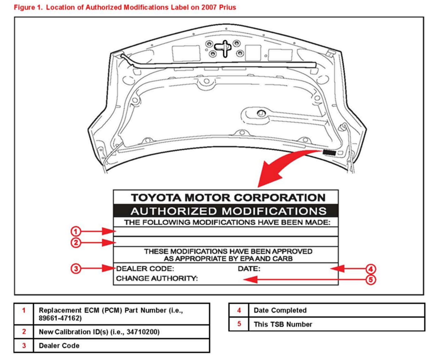 1. Check for the Authorized Modifications Label affixed to the vehicle in the location shown in Figure 1. Confirm if the ECM (PCM) calibration has been updated. If the calibration ID listed is NOT the latest ECM (PCM) calibration - go to step 2.