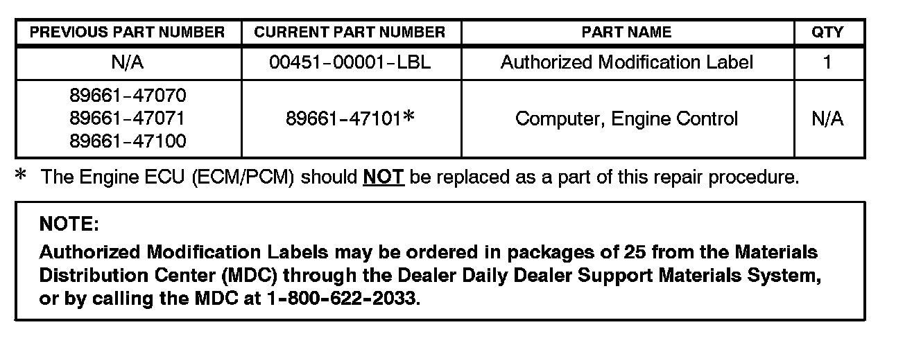This repair is covered under the Toyota Specified Major Emission Control Component Warranty. This warranty is in effect for 96 months or 80,000 miles, whichever occurs first, from the vehicle's in-service date.