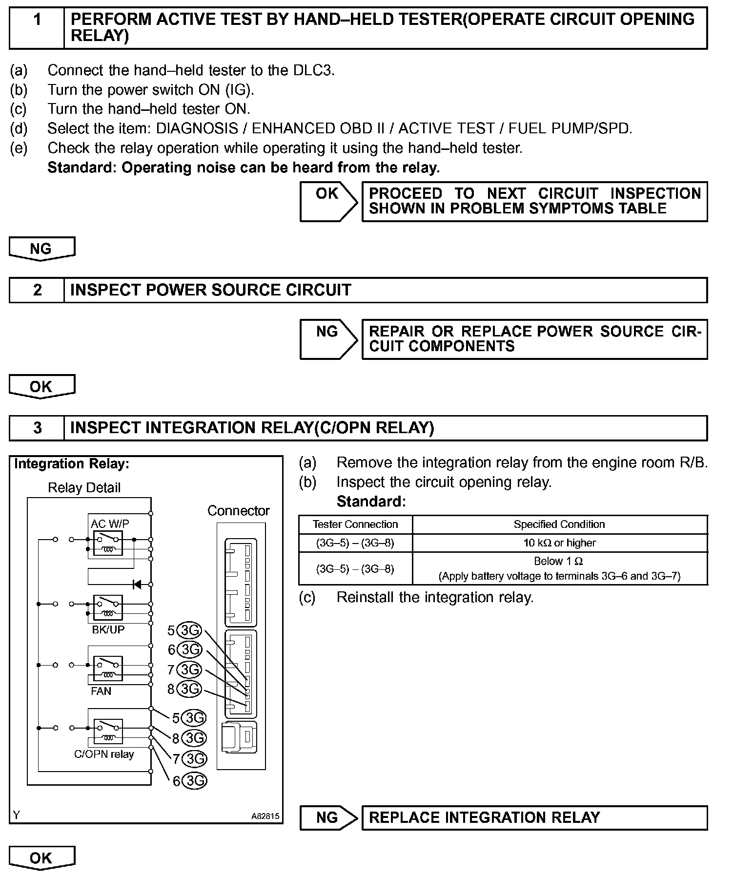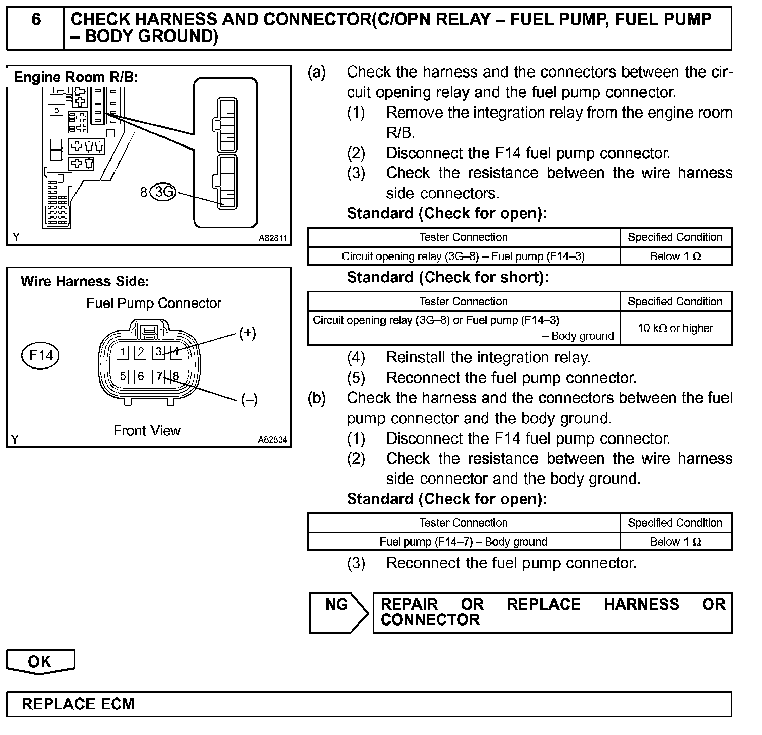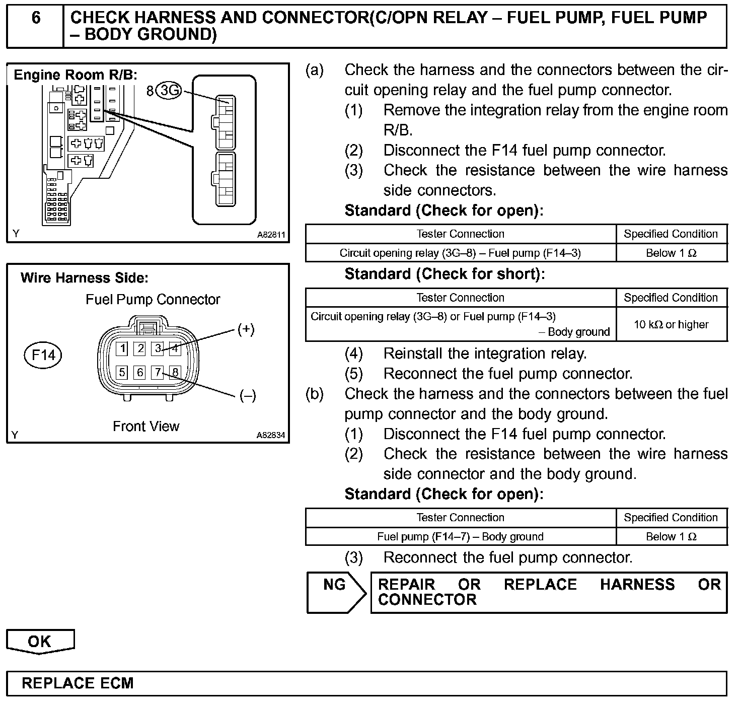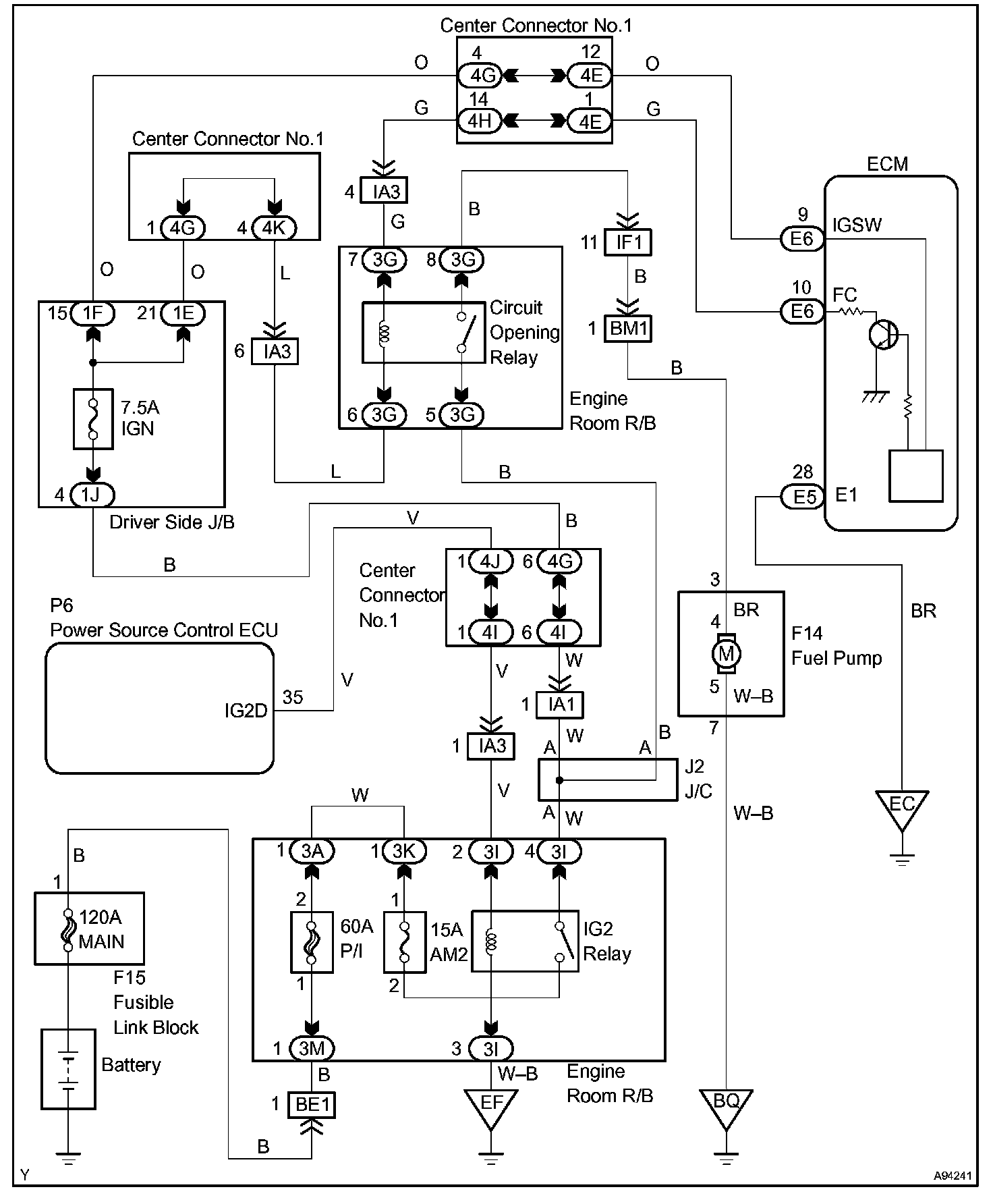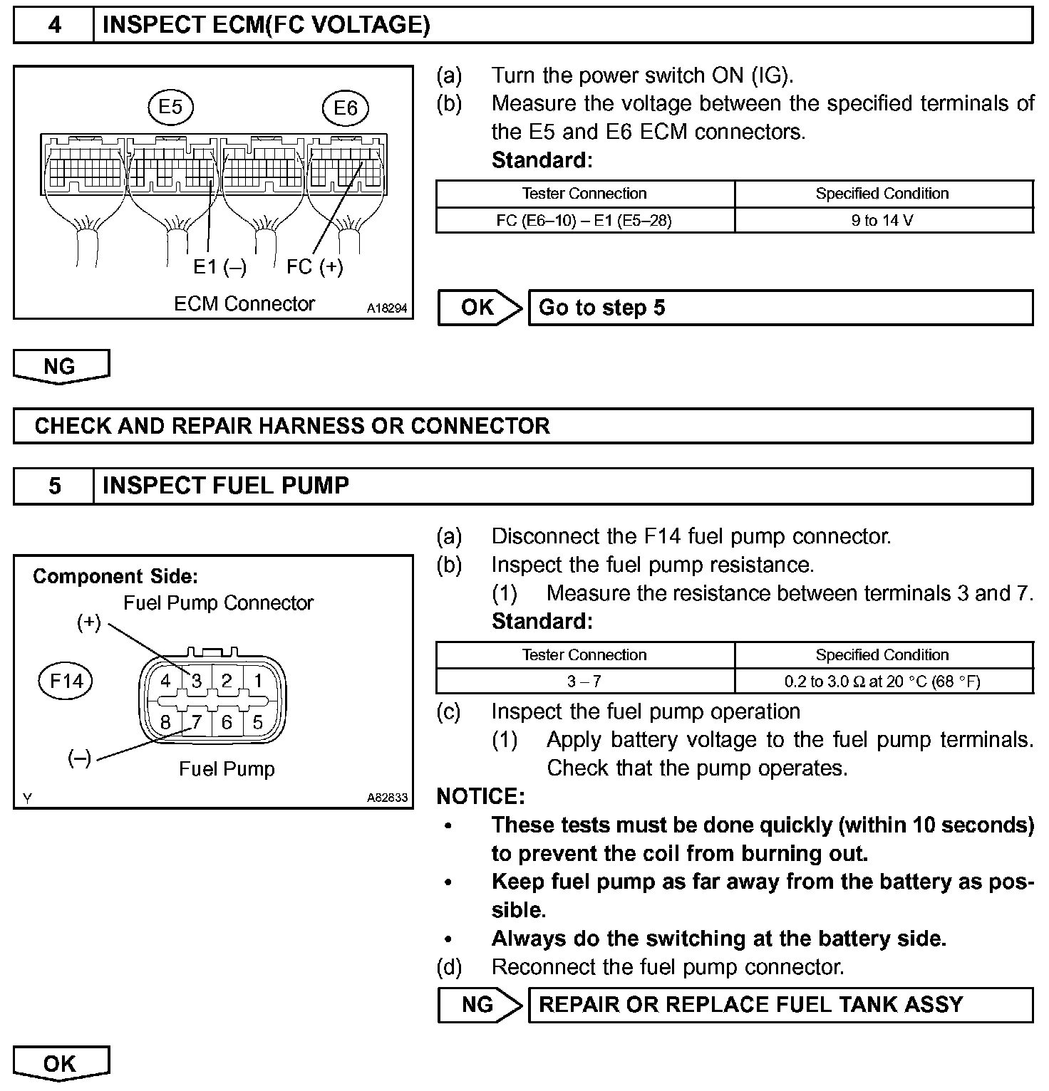 The ECM grounds the FC terminal line after receiving NE signal. It causes to energize the coil in the circuit opening relay, and the current flows to the fuel pump.