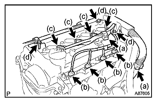 c. Install the fuel delivery pipe together with the 4 fuel injectors, then temporarily tighten the 3 bolts.