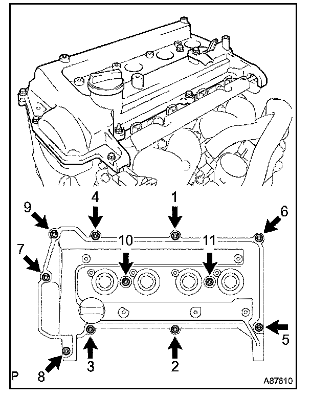 b. Tighten the 9 bolts, 2 seal washers and 2 nuts in the sequence shown in the illustration to install the cylinder head cover.
