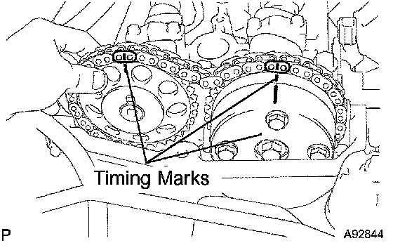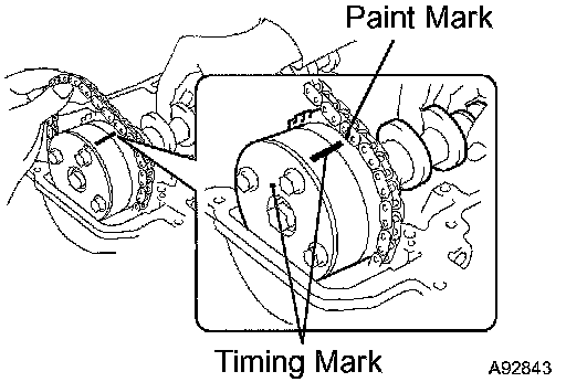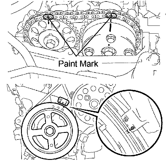 3. Put the paint marks on the timing chain plates which align with timing marks of the camshaft timing gear.