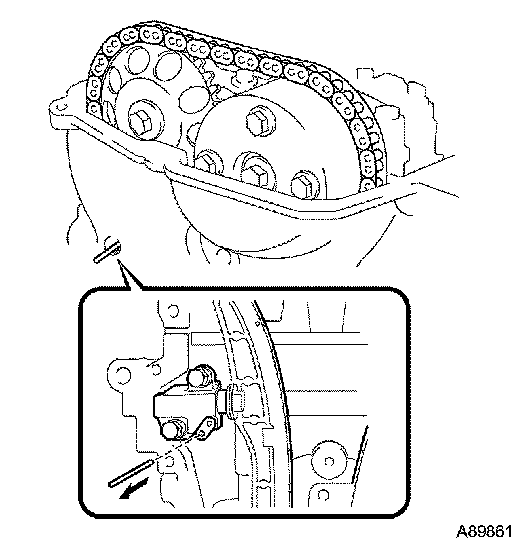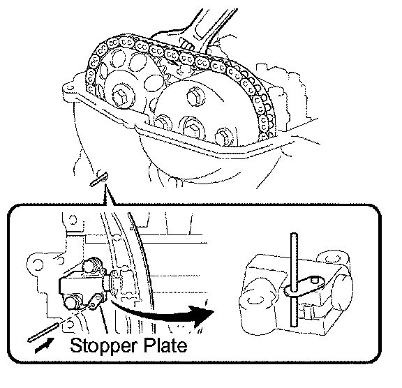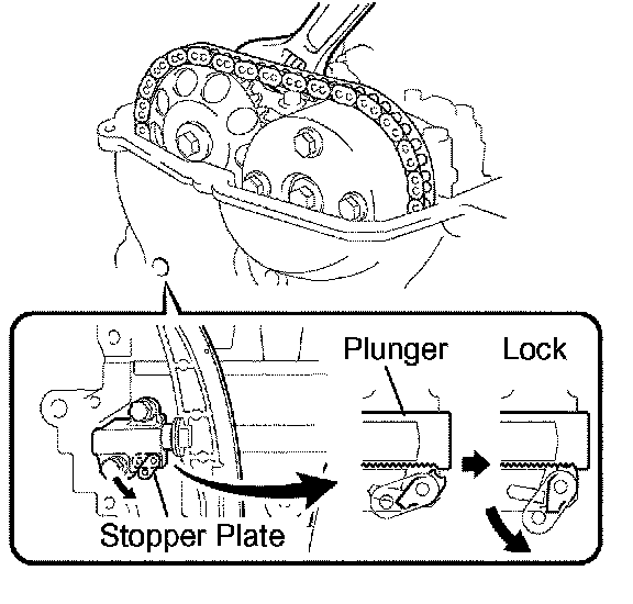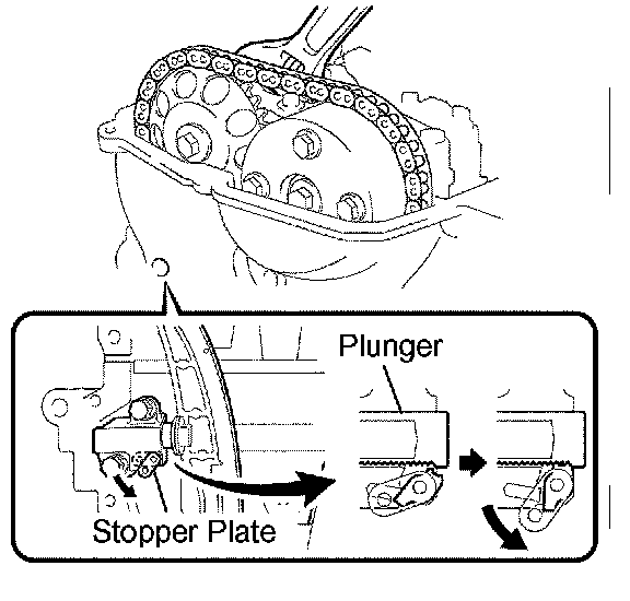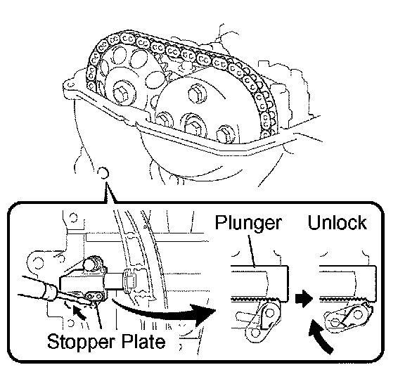 HINT: Lifting up the stopper plate of the chain tensioner unlocks the plunger.