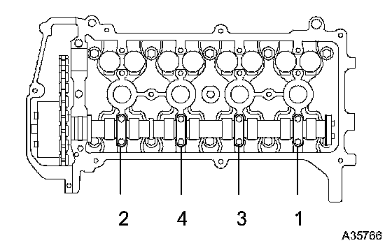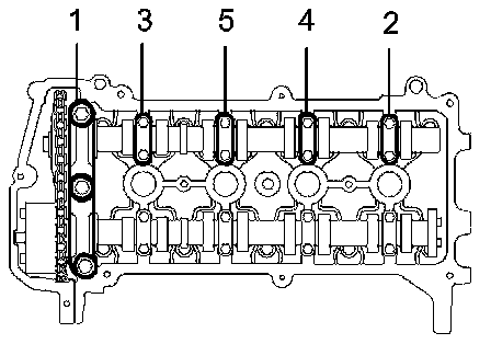 j. Remove the camshaft bearing caps No. 1 and No. 2 in the sequence shown in the illustration.