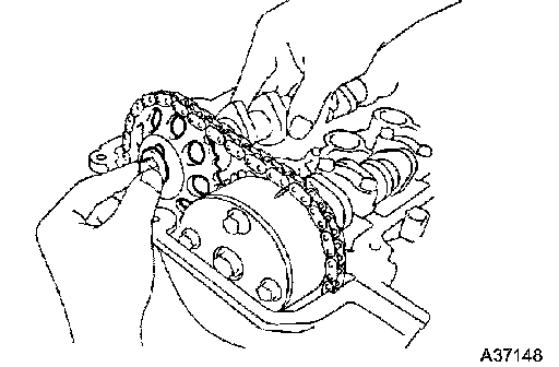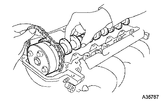 m. Hold the timing chain by hand, then remove the camshaft.