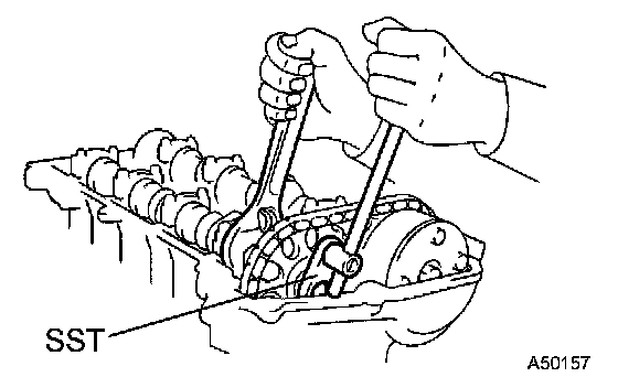 d. Keeping the stopper plate of the chain tensioner lifted, slightly rotate the hexagonal lobe of the camshaft No. 2 to the right with an adjustable wrench so the plunger of the chain tensioner is pushed.